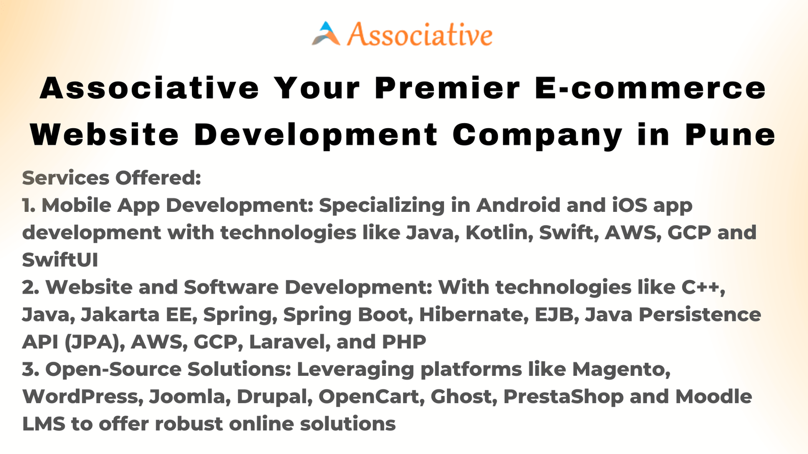 Associative, based in Lohegaon, Pune, is your premier E-commerce Website Development Company, ready to take your online business to new heights. Whether you need mobile app development, website and software solutions, or open-source expertise, Associative possesses the skills and experience to bring your e-commerce vision to life. Partner with Associative and embark on a journey to create a powerful and user-friendly online store that sets you apart in the competitive world of e-commerce.