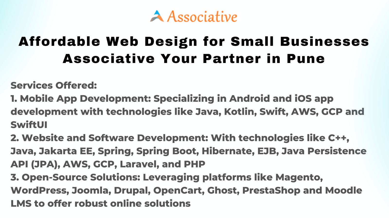 2. Website, Web Application, E-commerce, and Software Development: Associative understands that your website is your digital storefront. They utilize technologies like Java, Spring, Laravel, PHP, and Laravel to create websites, web applications, e-commerce platforms, and software solutions that are both functional and cost-effective. Whether you need a simple website to showcase your services or a full-fledged e-commerce platform to sell your products online, Associative offers affordable options tailored to the unique needs of your small business.