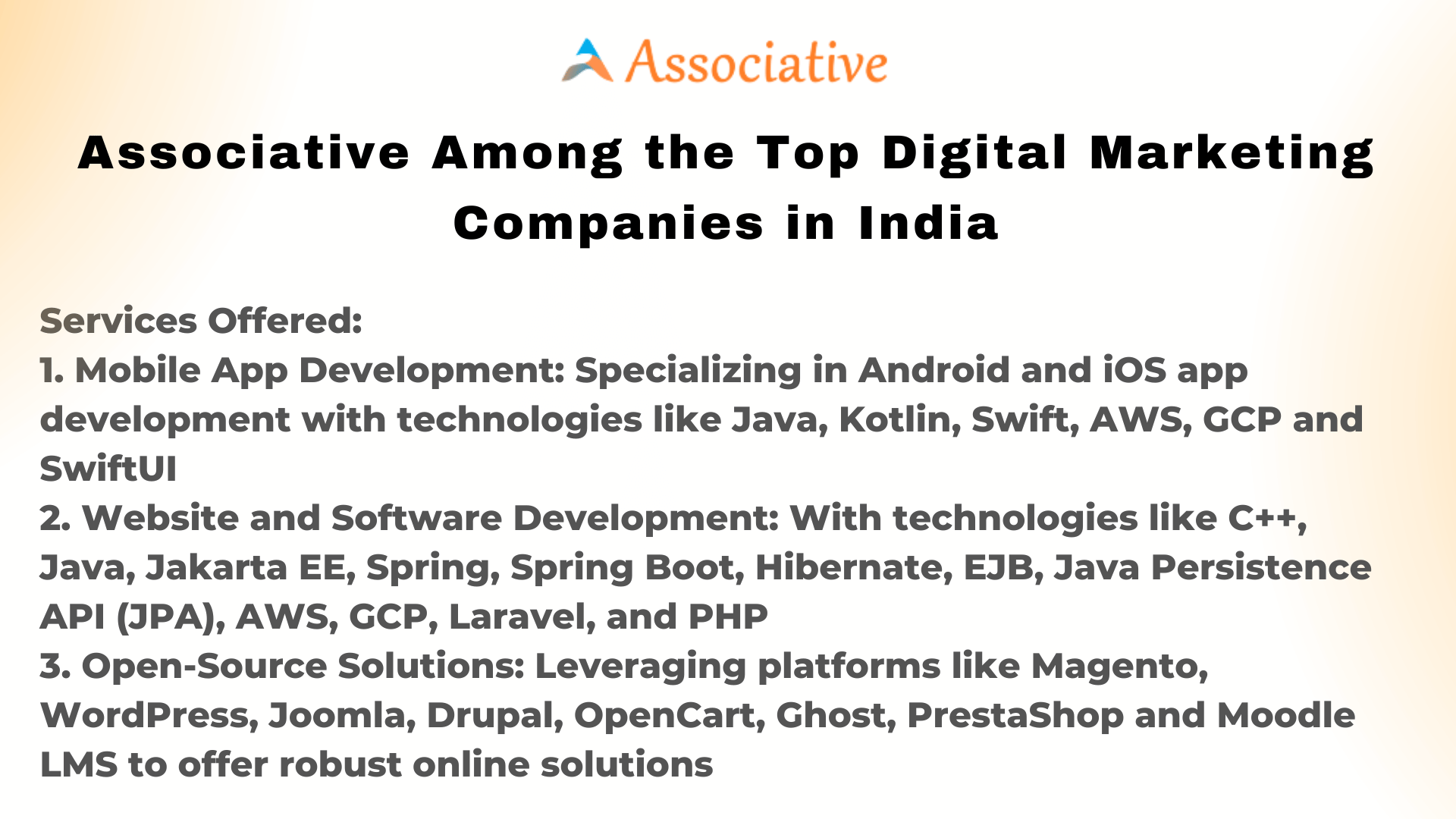 Associative, based in Lohegaon, Pune, is one of the Top Digital Marketing Companies in India, ready to elevate your digital marketing efforts. Whether you need mobile app development, website and software solutions, or open-source expertise, Associative possesses the skills and experience to take your digital marketing strategy to the next level. Partner with Associative and embark on a journey to enhance your online presence, engage your audience, and achieve your business objectives in the digital realm.