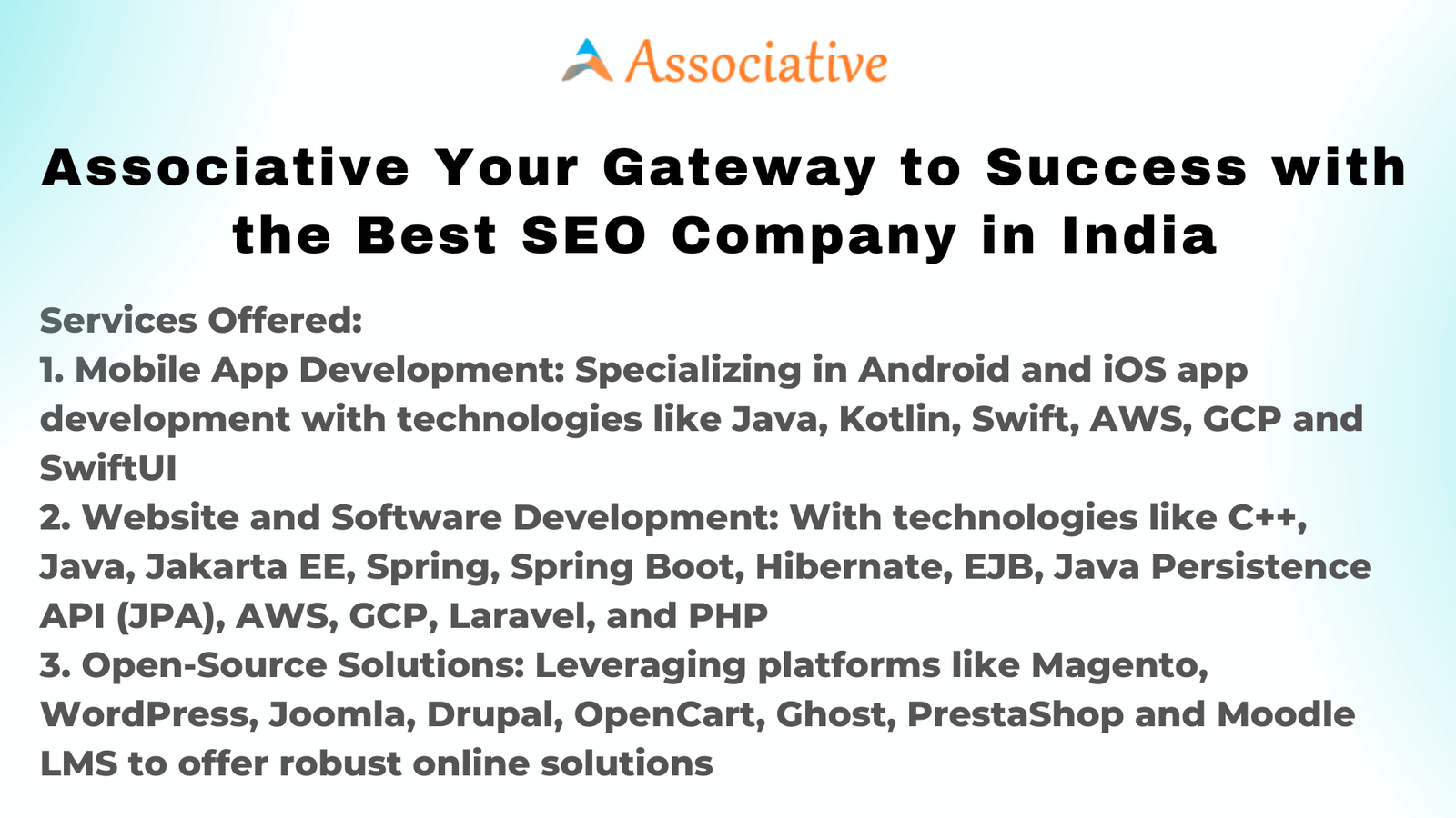 If you\’re in search of the best SEO company in India that can also provide topnotch mobile app development, website and software development, and opensource solutions, Associative should be your first choice. With a commitment to excellence and a clientcentric approach, Associative is your gateway to online success. Contact them today, and take the first step toward elevating your online presence and achieving your business goals. Success awaits with Associative by your side.