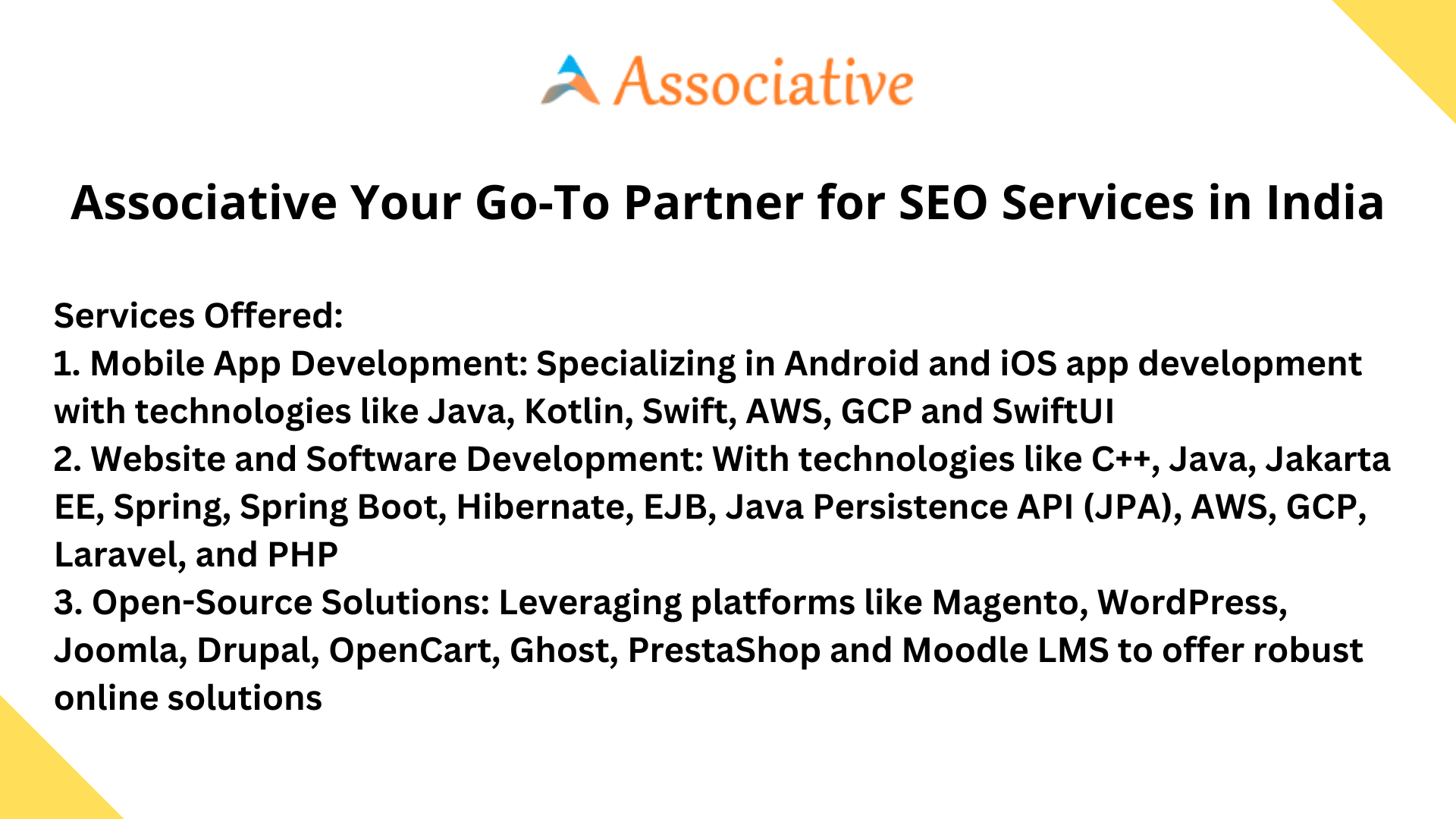 Associative is your trusted partner for SEO services in India, and we are here to assist you in achieving your online goals. Reach out to us today to embark on your digital journey and experience the transformative power of SEO!