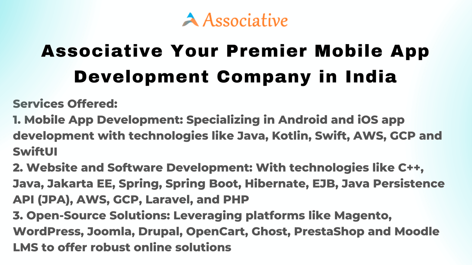 Associative, based in Lohegaon, Pune, is your premier Mobile App Development Company in India. Whether you need mobile app development, website and software solutions, or open-source expertise, Associative possesses the skills and experience to bring your app ideas to life. Partner with Associative and embark on a journey to create mobile apps that stand out in the competitive app market, cater to the diverse needs of your users, and help you achieve your business objectives.