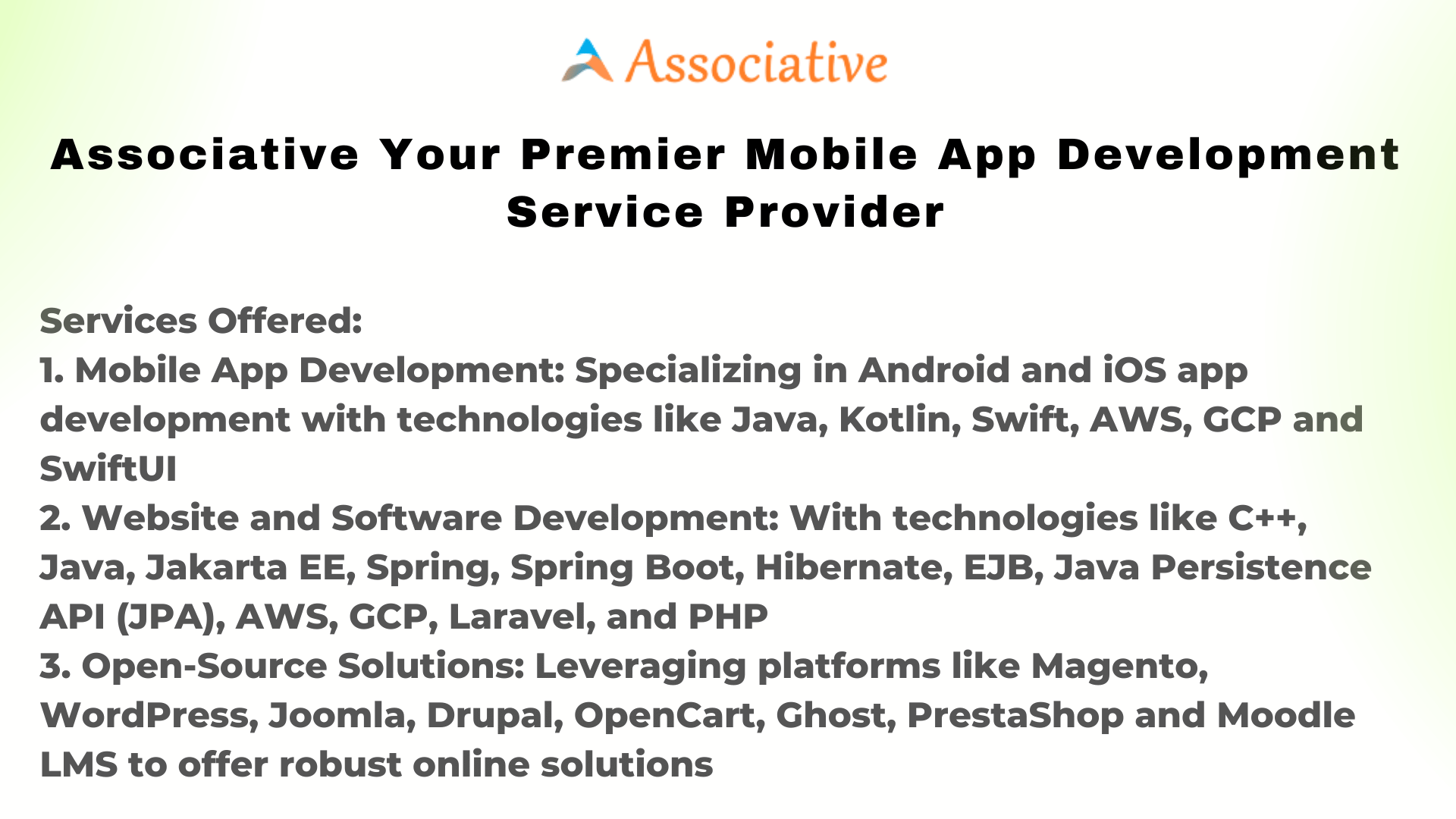 2. Comprehensive Range of Services: While mobile app development is our forte, we offer a comprehensive suite of services to cater to all your digital needs. Our team is well-versed in a wide array of technologies, including C++, Java, Jakarta EE, Spring, Spring Boot, Hibernate, EJB, Java Persistence API (JPA), AWS, GCP, Laravel, and PHP. Whether it\’s website development, software development, or other digital solutions, Associative is your one-stop destination.