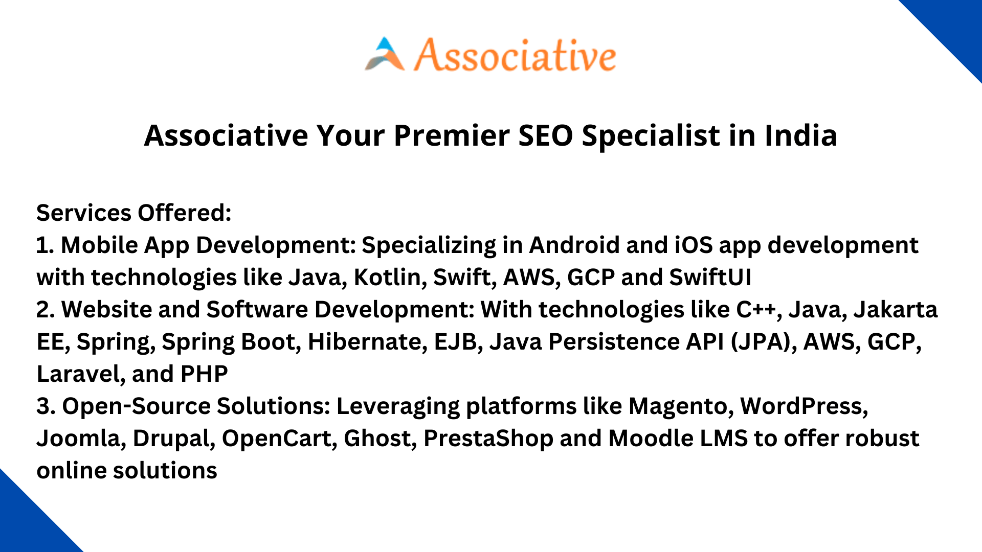 At Associative, we offer a comprehensive suite of specialized SEO services tailored to meet the diverse needs of businesses across India: