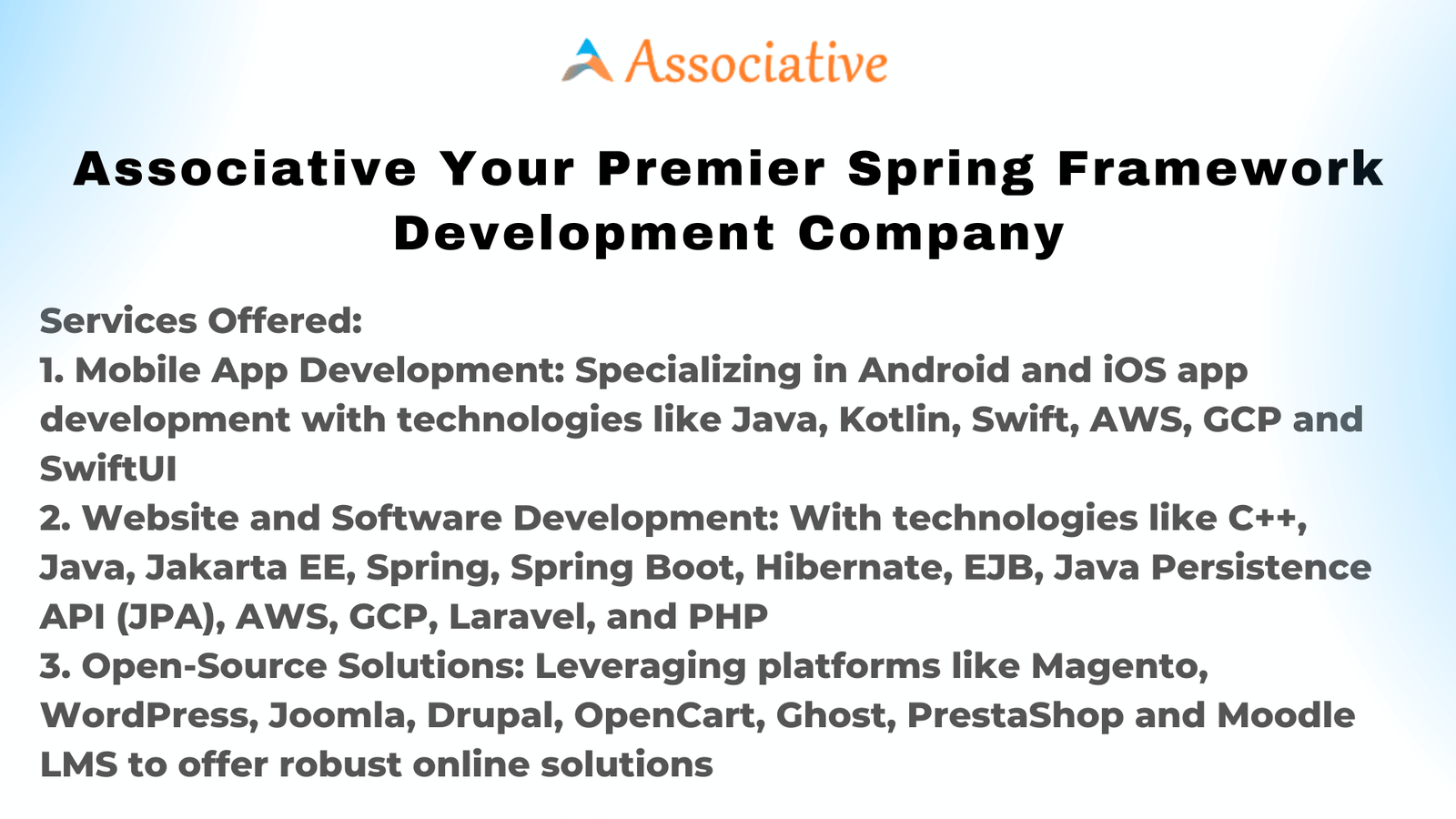 In conclusion, when you\’re on the lookout for a premier Spring Framework development company, Associative is your ultimate destination. With their profound expertise and a wide spectrum of digital services, they can empower your business to thrive in the ever evolving digital realm. Seize the opportunity to innovate and excel—choose Associative today!