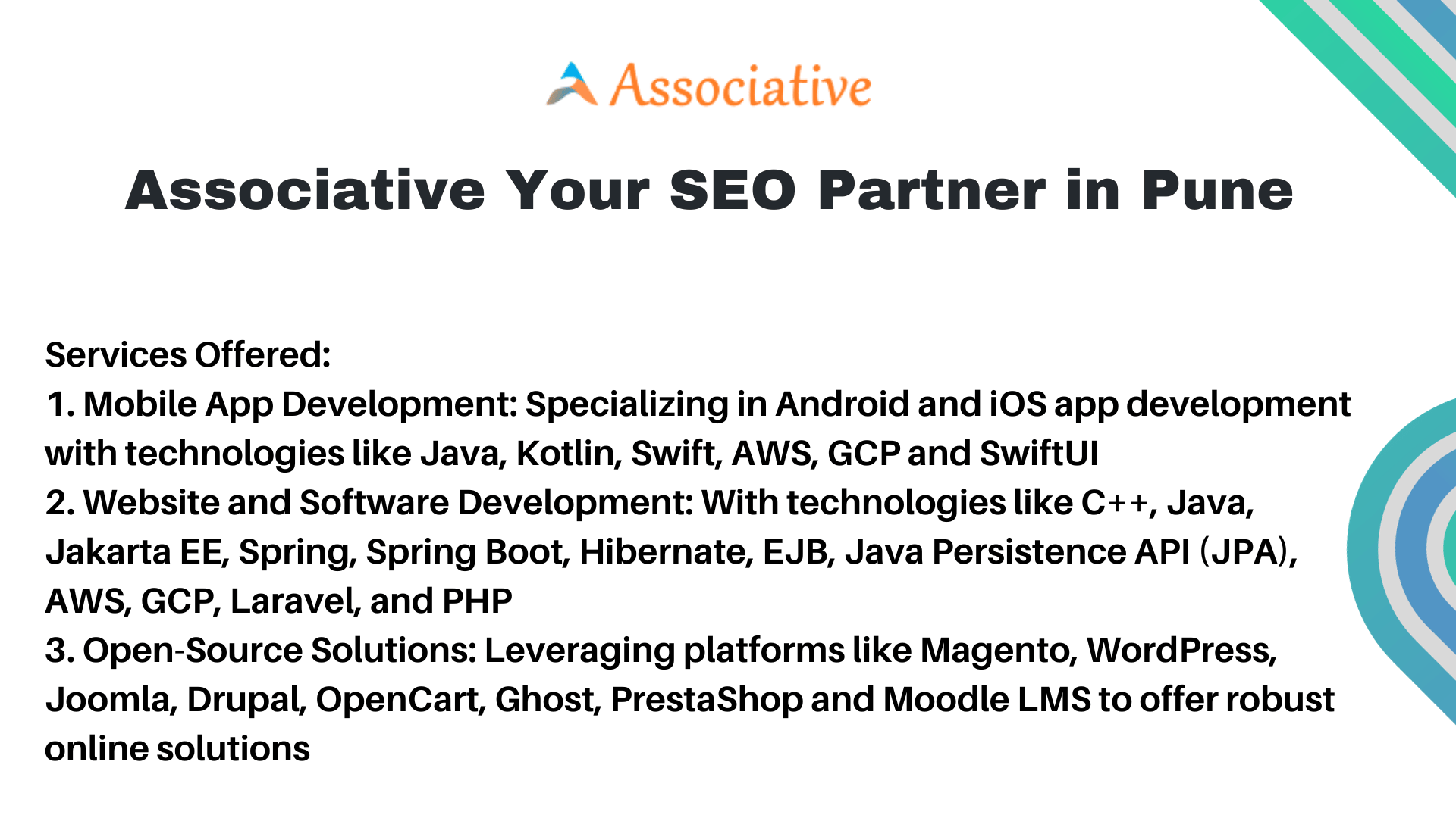 Associative, a prominent partnership firm based in Pune, Maharashtra, India, is your local expert in SEO services. We understand the unique challenges and opportunities that businesses in Pune face, and we are here to help you harness the power of SEO to grow your online presence and drive digital success.