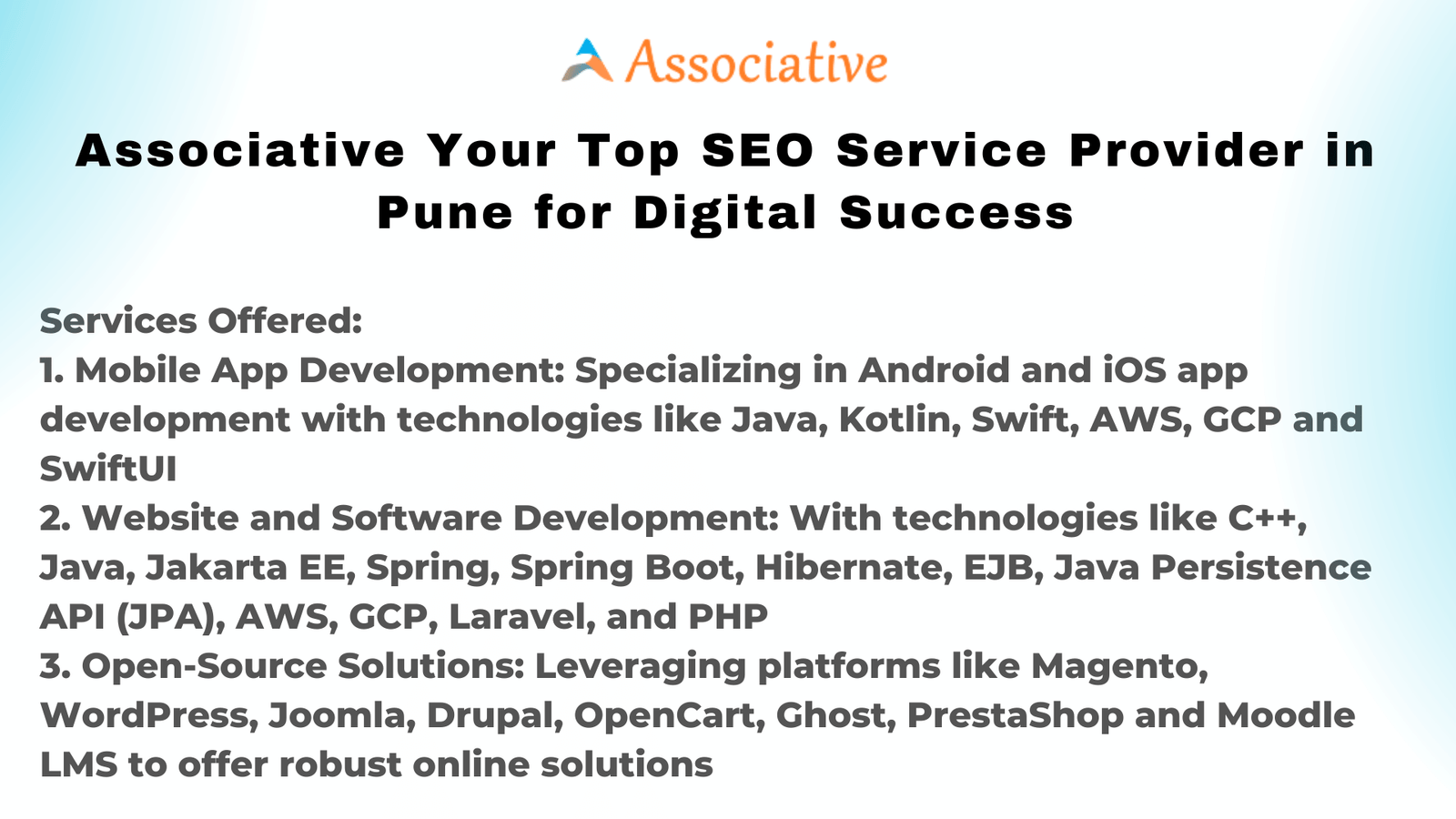 Associative, located in Lohegaon, Pune, is your top SEO service provider, offering a wide range of services, including mobile app development, website and software development, and open-source solutions. If you aspire to boost your online presence, increase organic traffic, and achieve higher search engine rankings in Pune, Associative has the expertise to make it happen. Contact us today to discuss your SEO requirements and embark on a journey toward digital success in Pune.