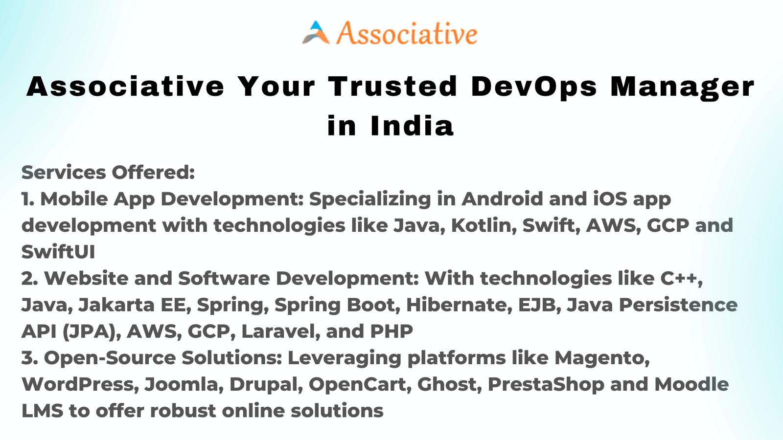 Associative, based in Lohegaon, Pune, is your trusted partner for mobile app development, website and software development, and open-source solutions across India. With their expertise and unwavering commitment to excellence, Associative can empower your business to thrive in the digital age. Contact them today and embark on a journey to enhance your business with innovative and reliable technology solutions. As your trusted DevOps manager in India, Associative is ready to streamline your digital processes and ensure your success in the dynamic and competitive Indian IT landscape.