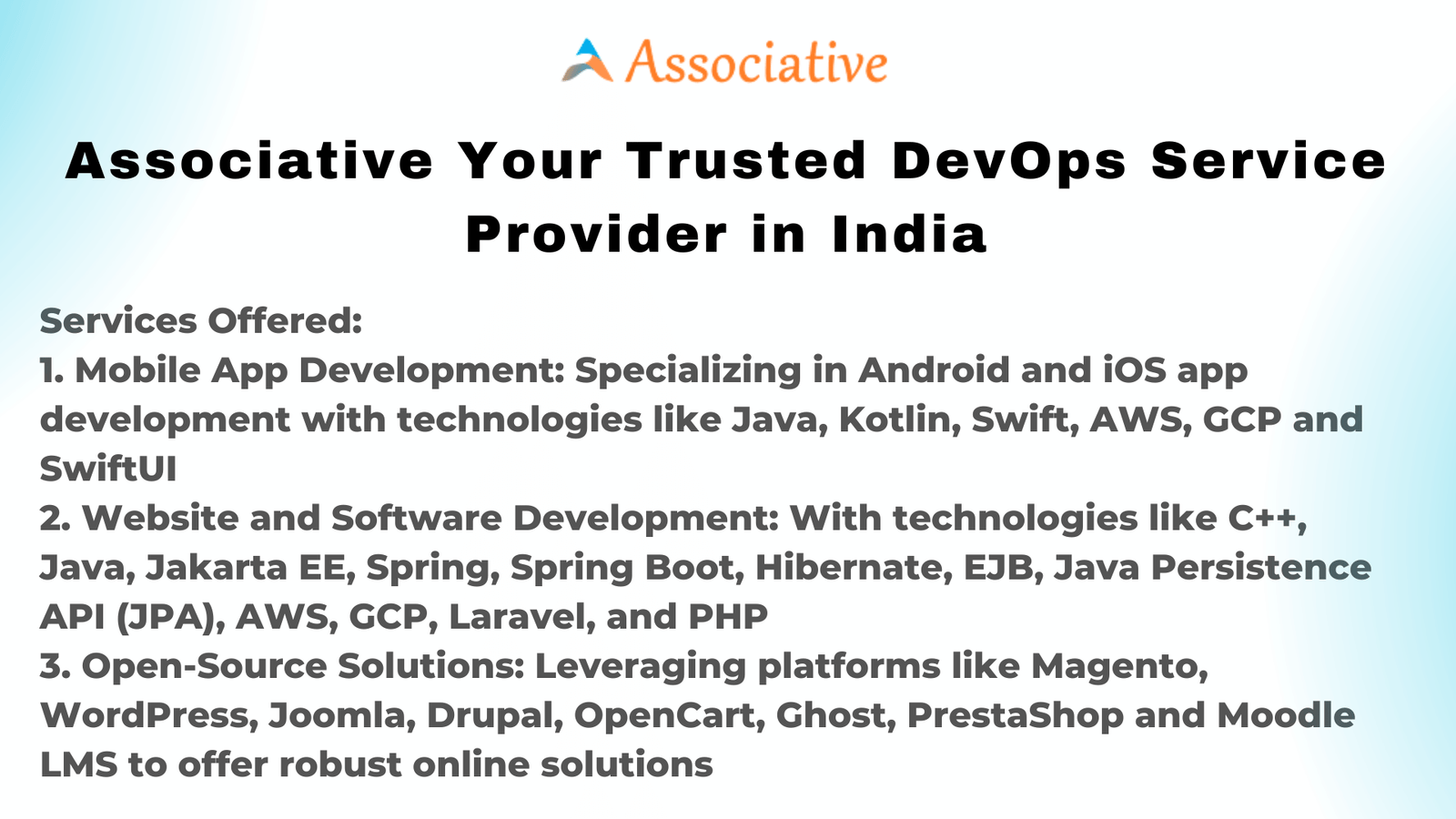 Associative, based in Lohegaon, Pune, is your trusted partner for mobile app development, website and software development, and open-source solutions across India. With their expertise and unwavering commitment to excellence, Associative can empower your business to thrive in the digital age within the Indian market. Contact them today and embark on a journey to enhance your business with innovative and reliable technology solutions. As your trusted DevOps service provider in India, Associative is ready to streamline your digital processes and ensure your success in the competitive and dynamic Indian IT landscape.