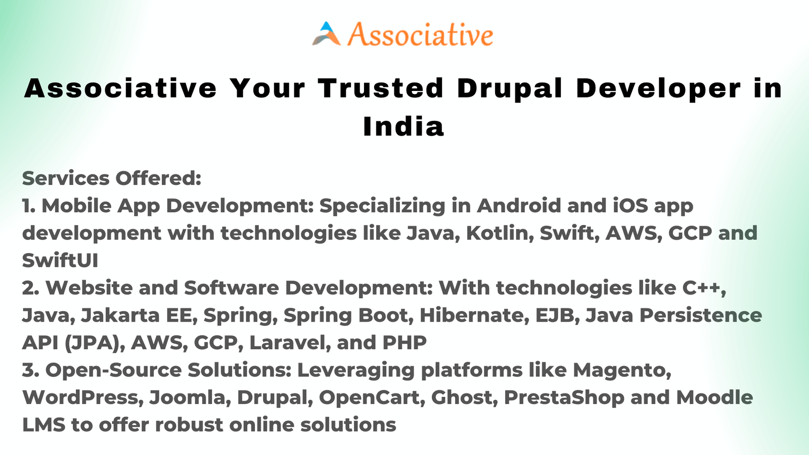When it comes to Drupal development in India, Associative is the name you can trust. With their expertise in Drupal, mobile app development, website and software development, and opensource solutions, Associative is wellequipped to elevate your online presence and help you achieve your digital goals.