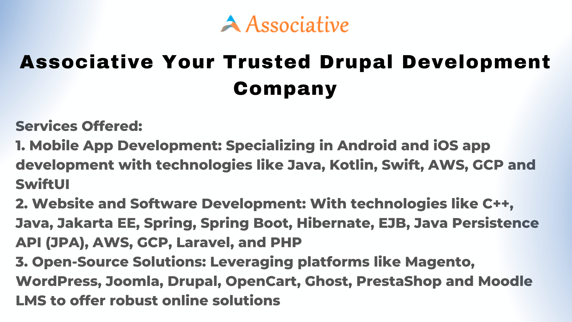 When it comes to Drupal development, Associative is the Drupal development company you can trust. With their expertise in Drupal, mobile app development, website and software development, and opensource solutions, Associative is wellequipped to elevate your online presence and help you achieve your digital goals.