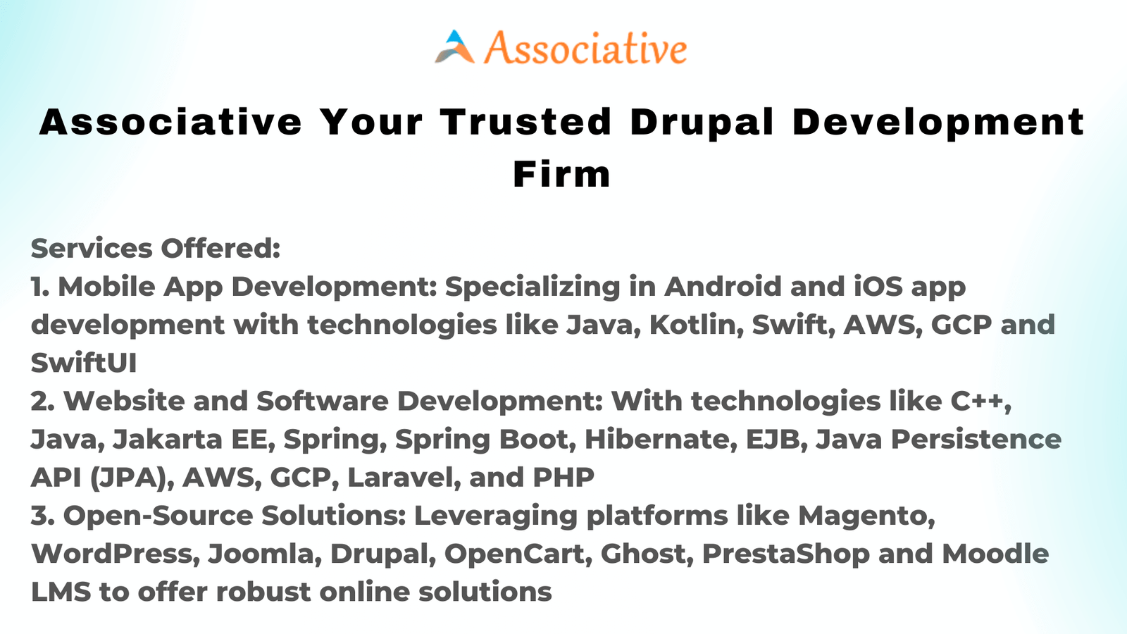 When it comes to Drupal development, Associative is the Drupal development firm you can trust. With their expertise in Drupal, mobile app development, website and software development, and opensource solutions, Associative is wellequipped to elevate your online presence and help you achieve your digital goals.