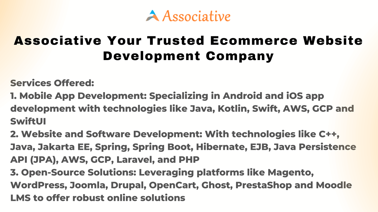 For businesses seeking cost-effective and reliable solutions, Associative offers open-source platforms. They harness popular platforms such as Magento, WordPress, Joomla, Drupal, OpenCart, Ghost, PrestaShop, and Moodle LMS (Learning Management System) to provide robust online solutions. These platforms serve as a solid foundation for building e-commerce websites, blogs, content management systems, and online learning platforms. Associative can customize these open-source solutions to meet your specific requirements, ensuring that your online presence is not only functional but also visually appealing and user-friendly.