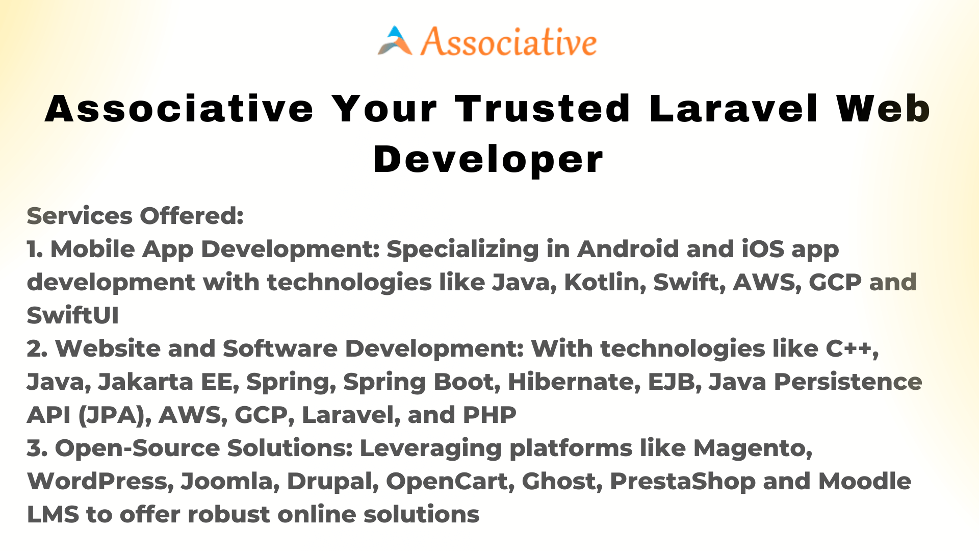 2. Website and Software Development: Beyond mobile apps, Associative excels in website and software development. They harness a wide range of technologies, including C++, Java, Jakarta EE, Spring, Spring Boot, Hibernate, EJB, Java Persistence API (JPA), AWS, GCP, Laravel, and PHP, to deliver customized solutions. Whether you need a dynamic website or a sophisticated software application, Associative has the expertise to deliver.