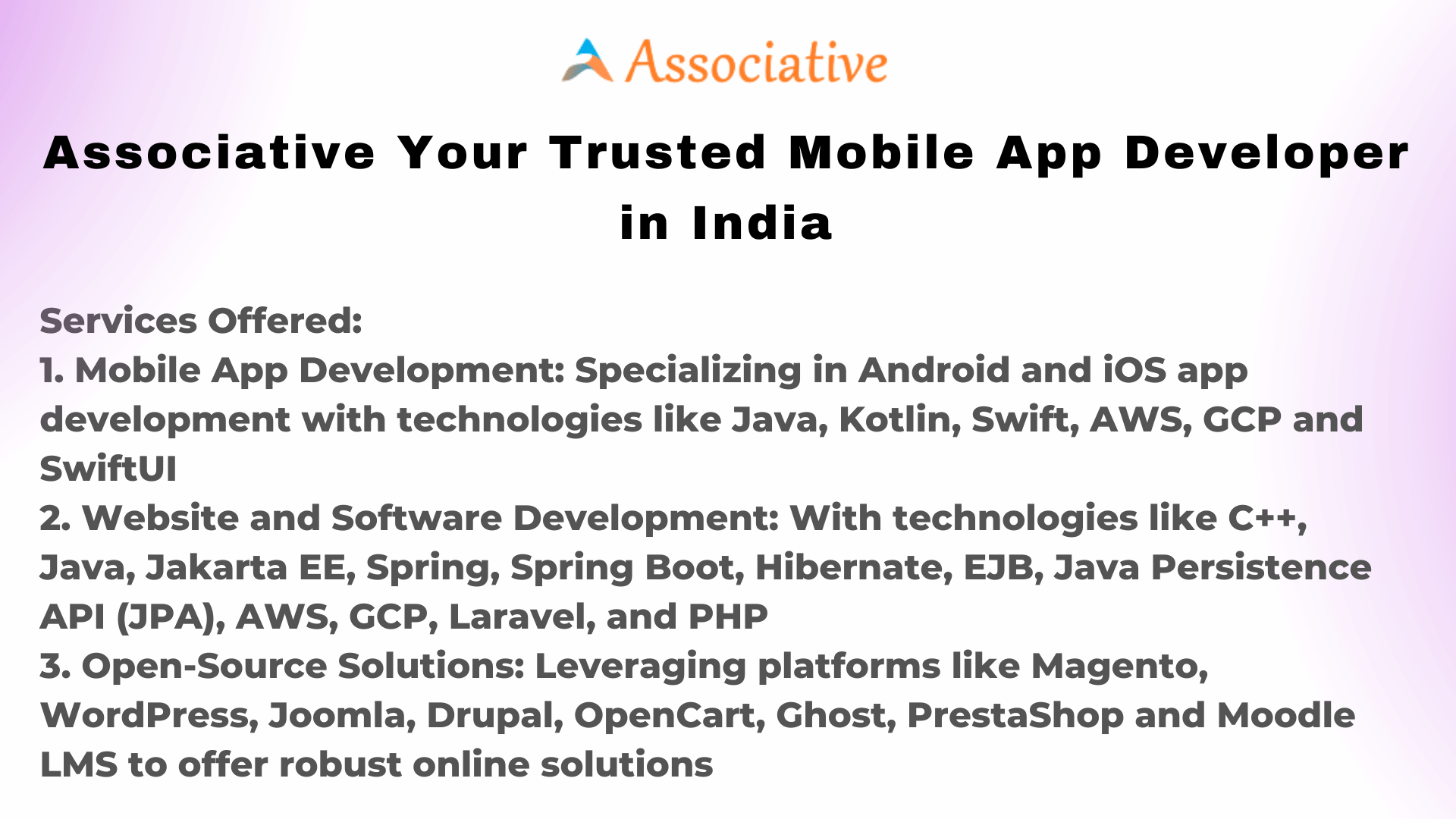 Associative, based in Lohegaon, Pune, is your trusted Mobile App Developer in India. Whether you need Android or iOS app development, website and software solutions, or open-source expertise, Associative possesses the skills and experience to bring your mobile app ideas to life. Partner with Associative and embark on a journey to create mobile apps that cater to the diverse needs of your users, captivate your audience, and help you achieve your business objectives in the digital realm.