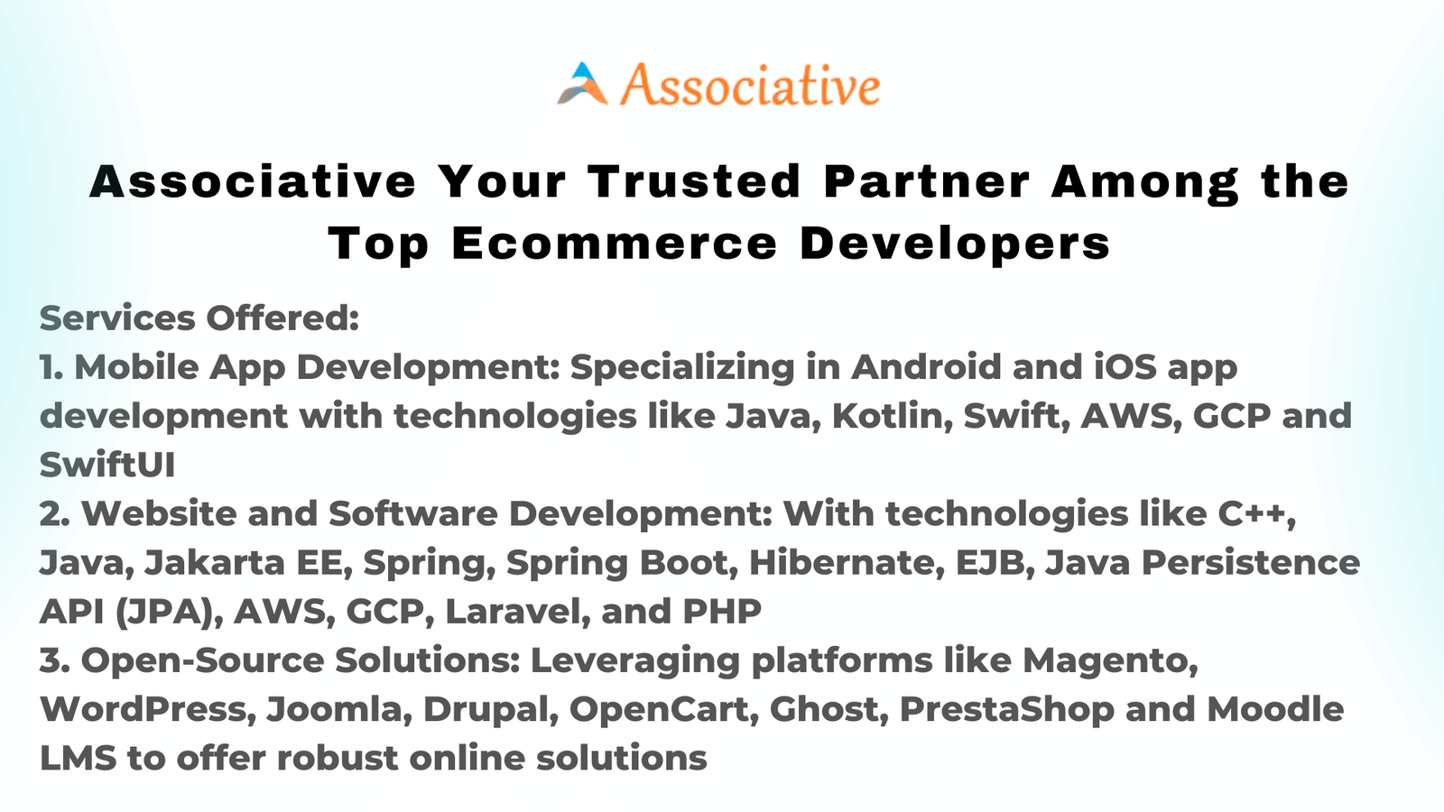 Whether you are a startup with ambitious ecommerce goals, an established business looking to expand your digital reach, or an individual seeking cuttingedge ecommerce solutions, Associative is your trusted partner. We invite you to explore the possibilities of our ecommerce development services and experience the difference of working with one of the top ecommerce developers.