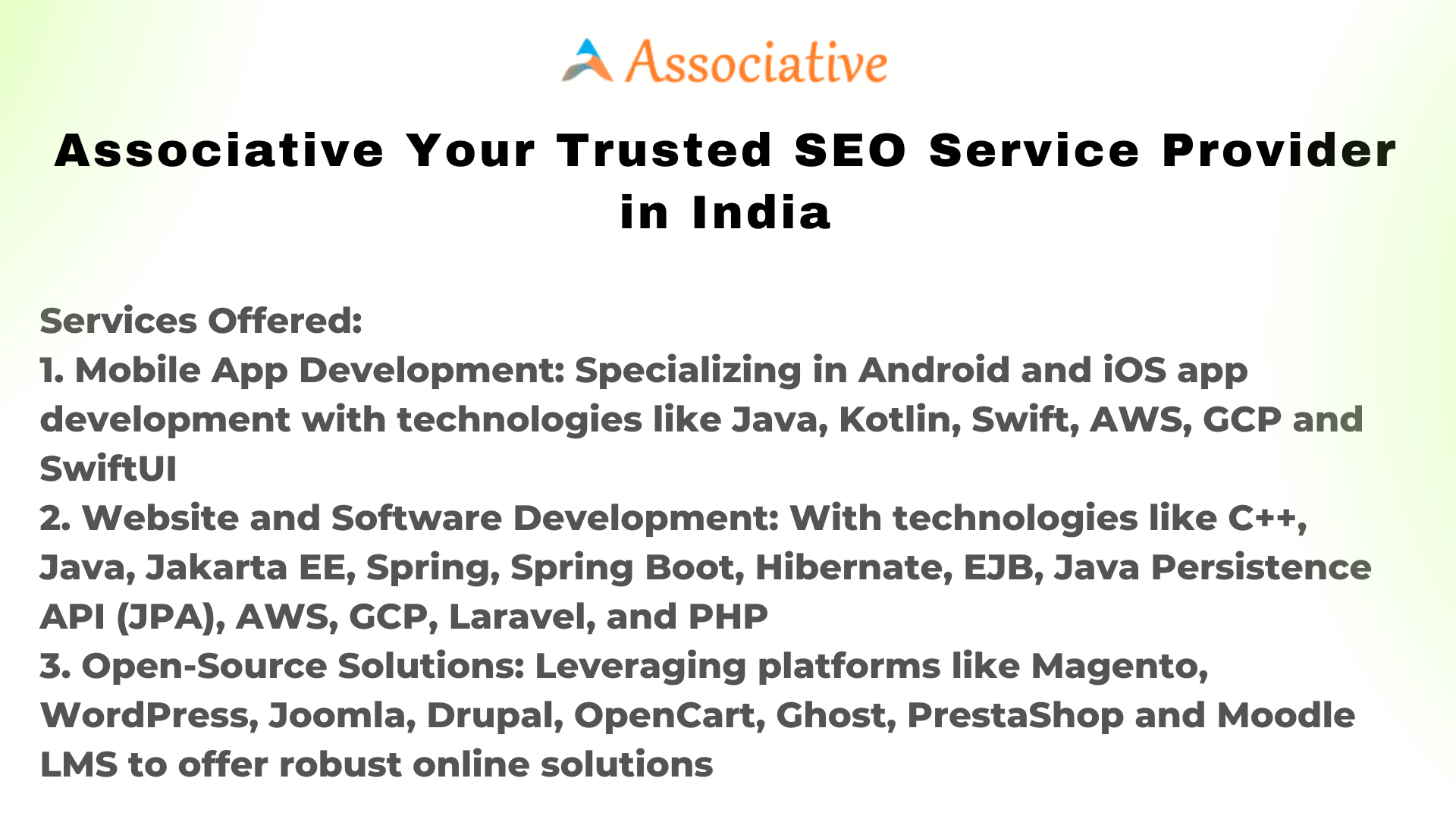 Associative, situated in Lohegaon, Pune, is your trusted SEO service provider in India, offering a comprehensive range of services, including mobile app development, website and software development, and open-source solutions. If you aspire to enhance your online presence, increase organic traffic, and achieve higher search engine rankings in India, Associative has the expertise to make it happen. Contact us today to discuss your SEO needs and embark on a journey toward digital success in the Indian market.