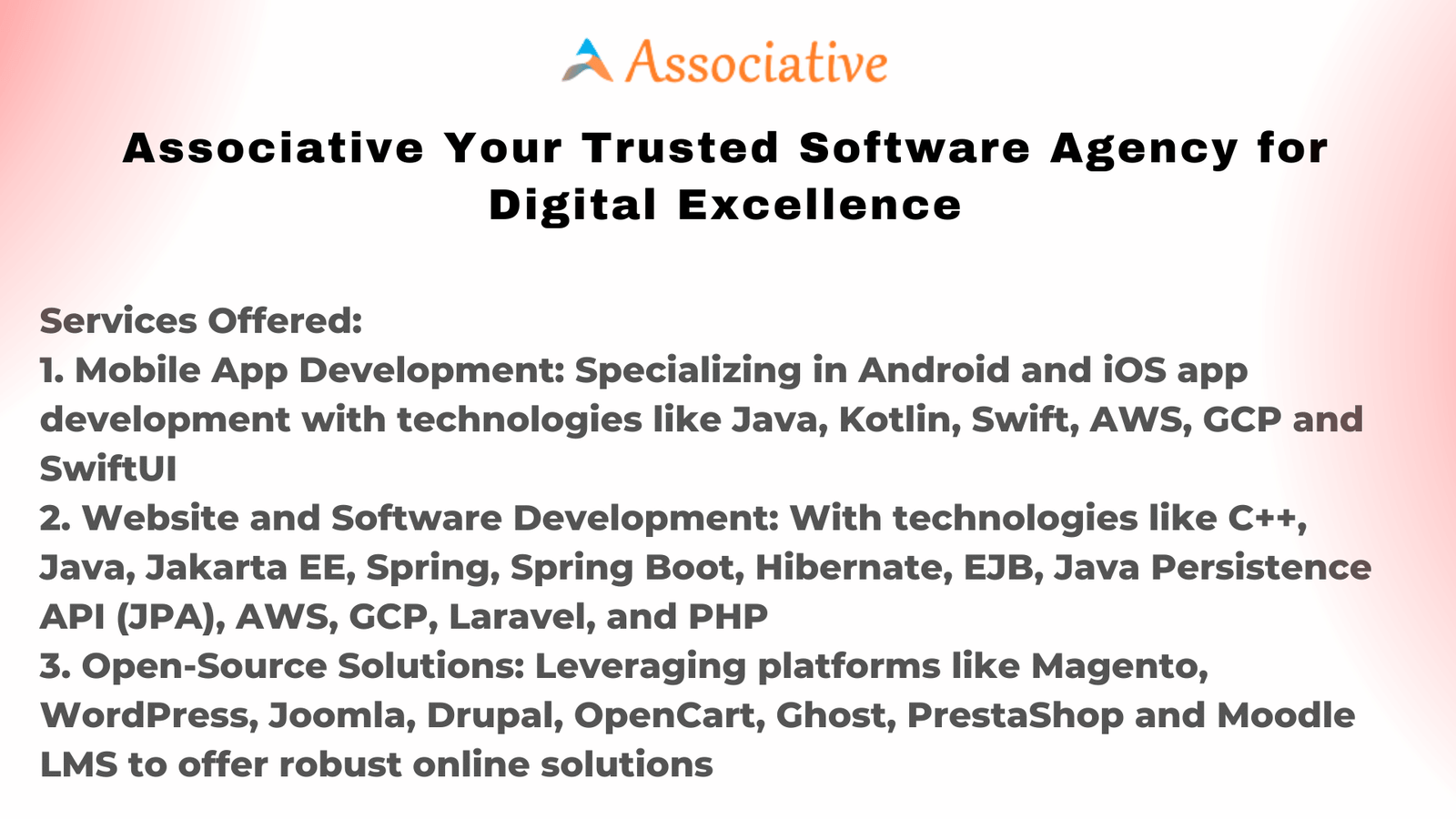 2. Website and Software Development: A robust online presence starts with a well-designed website and software applications. Associative excels in this area, utilizing a wide range of technologies, including C++, Java, Jakarta EE, Spring, Spring Boot, Hibernate, EJB, Java Persistence API (JPA), AWS, GCP, Laravel, and PHP to deliver exceptional solutions that are tailored to your business.