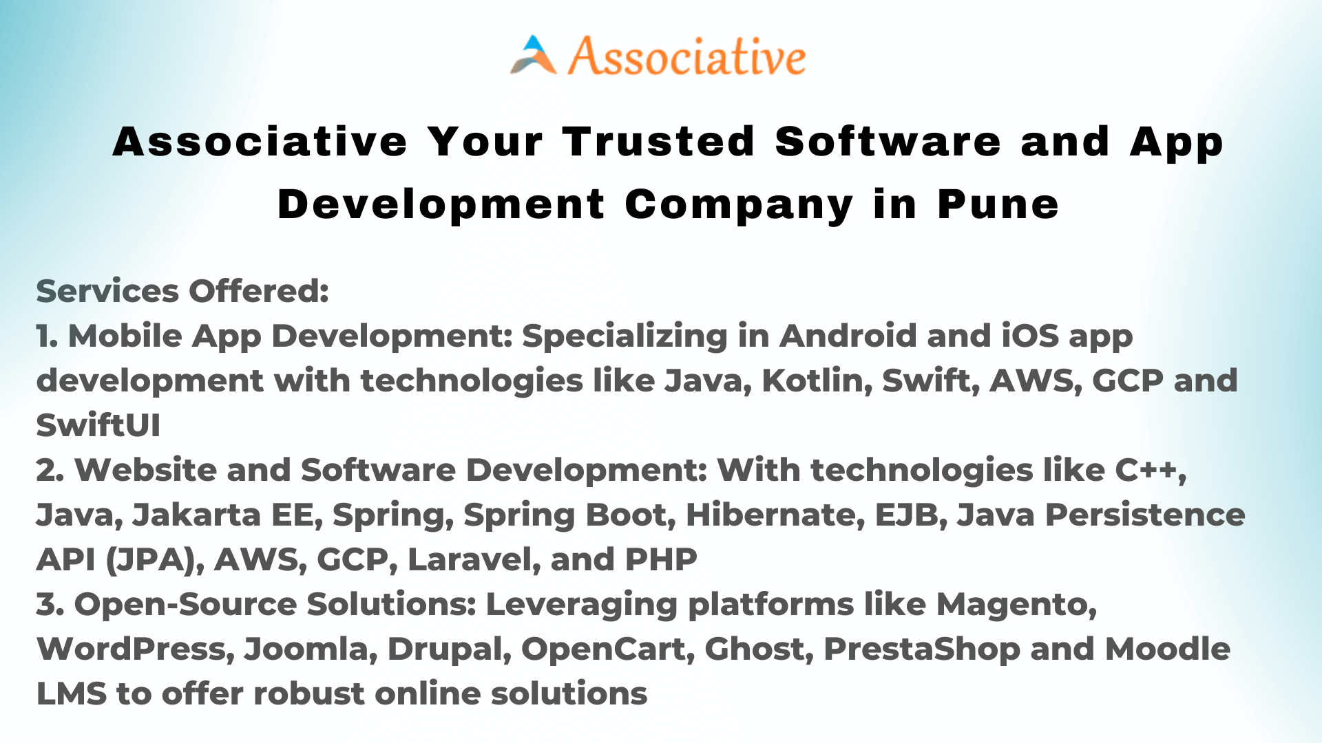 Your website and software solutions are the backbone of your online presence. Associative\’s proficiency in technologies like C++, Java, Jakarta EE, Spring, Spring Boot, Hibernate, EJB, Java Persistence API (JPA), AWS, GCP, Laravel, and PHP enables them to create websites and software that are both visually appealing and highly functional.