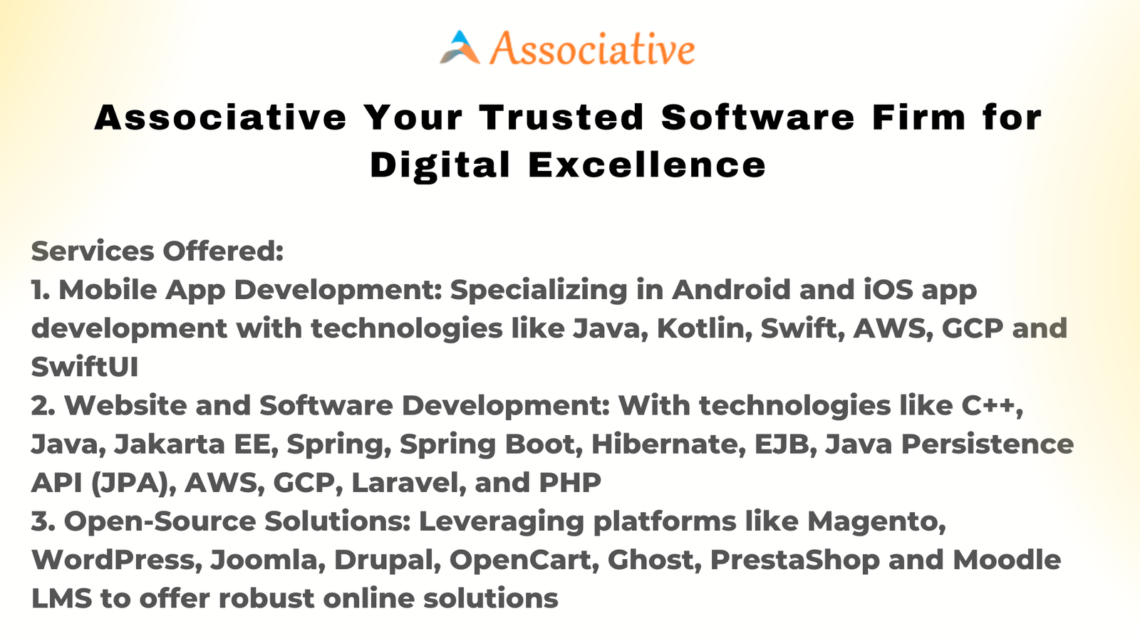 In conclusion, when you\’re in search of a reliable software firm, Associative should be your first choice. With their deep expertise and a wide array of digital services, they can help your business thrive in the ever-evolving digital landscape. Don\’t miss out on the opportunity to achieve digital excellence—choose Associative today!
