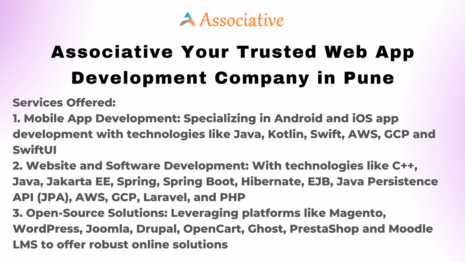 When it comes to finding a reliable Web App Development Company in Pune, Associative emerges as your go-to partner to turn your web app ideas into reality. Whether it\’s mobile app development, website creation, or open-source solutions, we have the expertise to exceed your expectations.