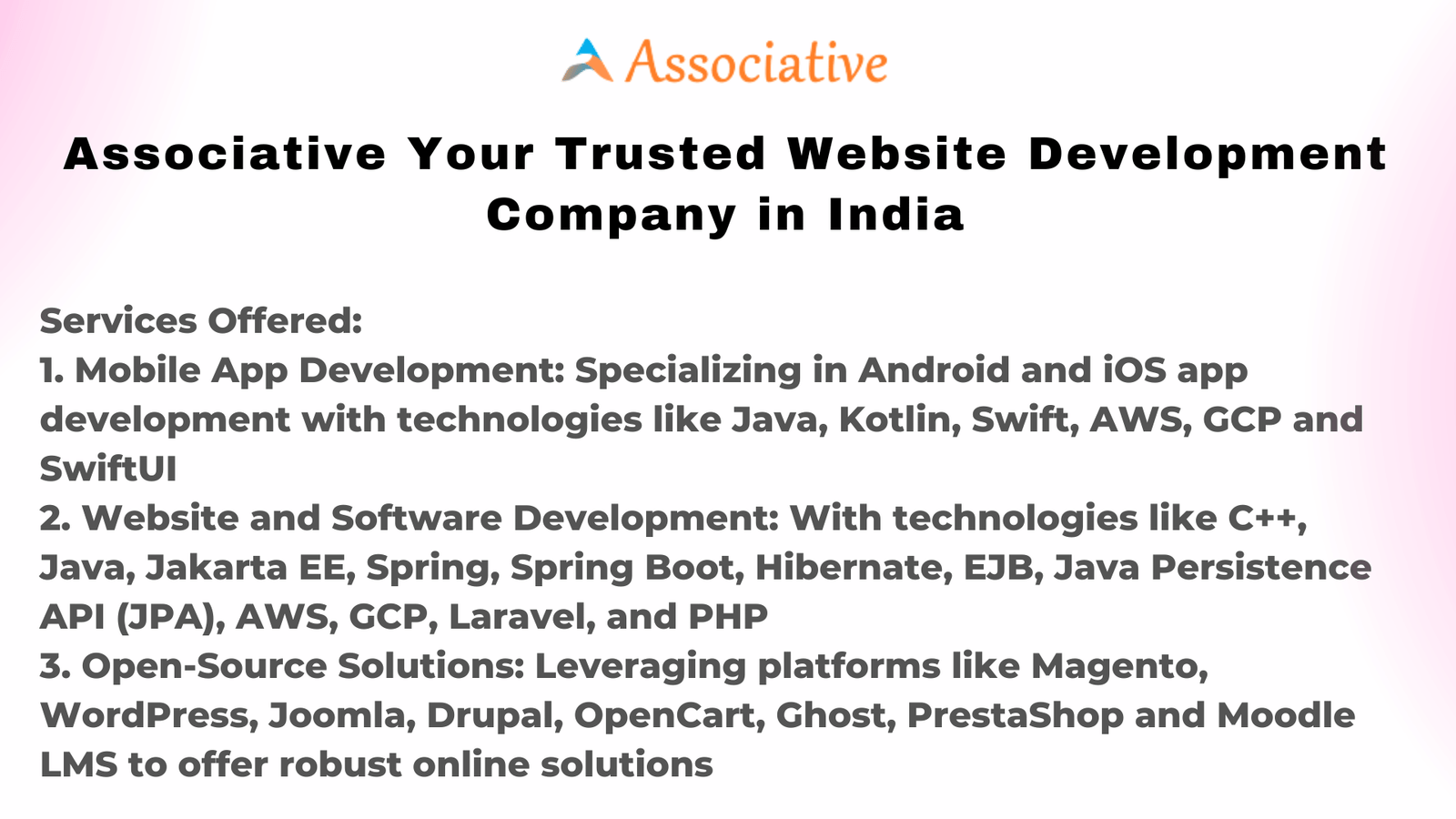 Associative is your trusted website development company in India, dedicated to helping your business thrive in the digital landscape. Whether you need a mobile app, a website, or open-source solutions, we have the expertise to bring your digital aspirations to life.