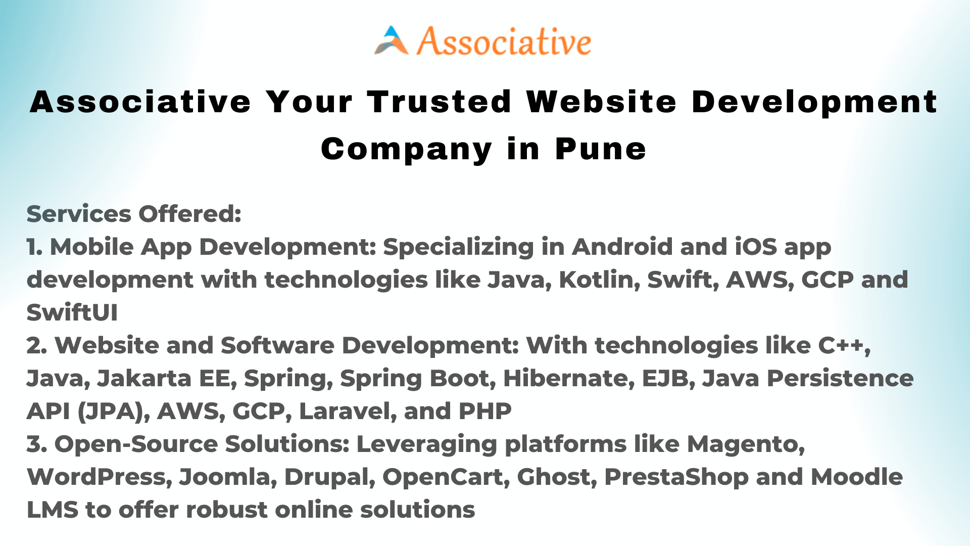 Associative, based in Lohegaon, Pune, is your trusted Website Development Company, poised to help you establish a compelling online presence. Whether you need mobile app development, website and software solutions, or open-source expertise, Associative possesses the skills and experience to bring your digital vision to life. Partner with Associative and embark on a journey to create a powerful and user-friendly website that sets you apart in the digital world.