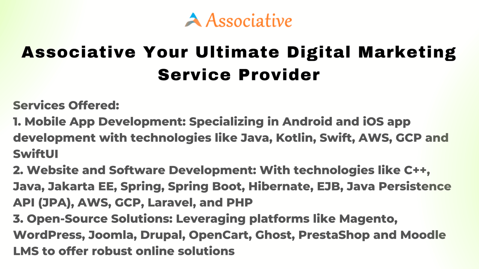 In the competitive world of digital marketing, having a reliable partner like Associative can be a gamechanger. With their expertise in mobile app development, website and software development, and opensource solutions, Associative is wellequipped to elevate your online presence and help you achieve your digital marketing goals.