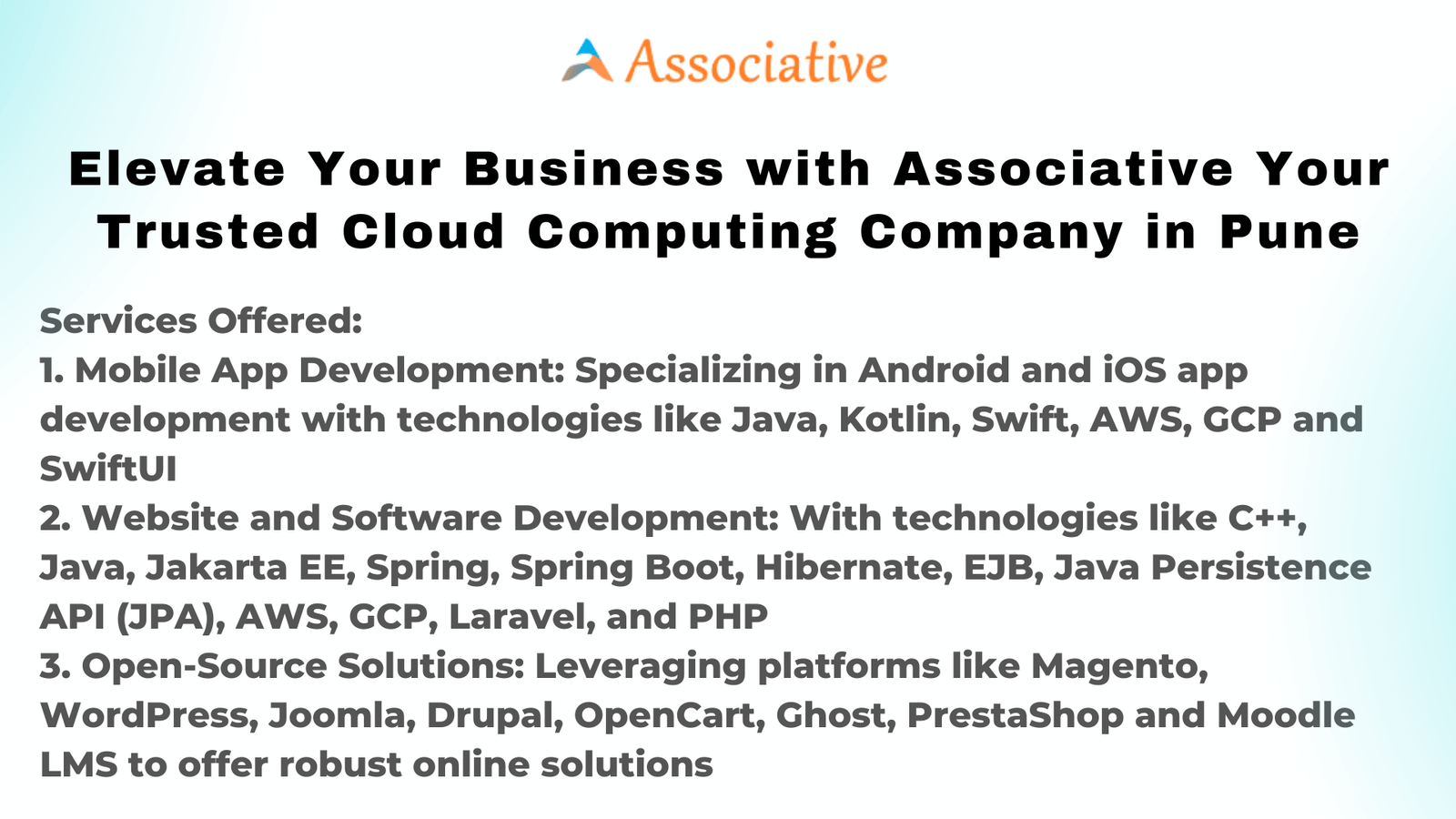 Associative, the leading cloud computing company situated in Lohegaon, Pune, is your ultimate partner for mobile app development, website and software development, and open-source solutions. With their expertise and unwavering commitment to excellence, Associative can empower your business to thrive in the digital age. Reach out to them today and embark on a journey to enhance your business with innovative and reliable technology solutions.