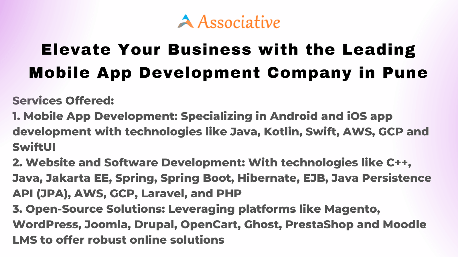 Associative, the premier mobile app development company in Pune, is dedicated to helping businesses thrive in the digital landscape. With a focus on Android and iOS app development, a wide range of technology expertise, and a commitment to delivering exceptional results, we are your trusted partner for digital success. Whether you are looking to create a mobile app, enhance your website, or explore open-source solutions, Associative has the skills and experience to turn your ideas into reality. Join hands with us to take your business to new heights of success. Contact us today to discuss your project and embark on a transformative journey!