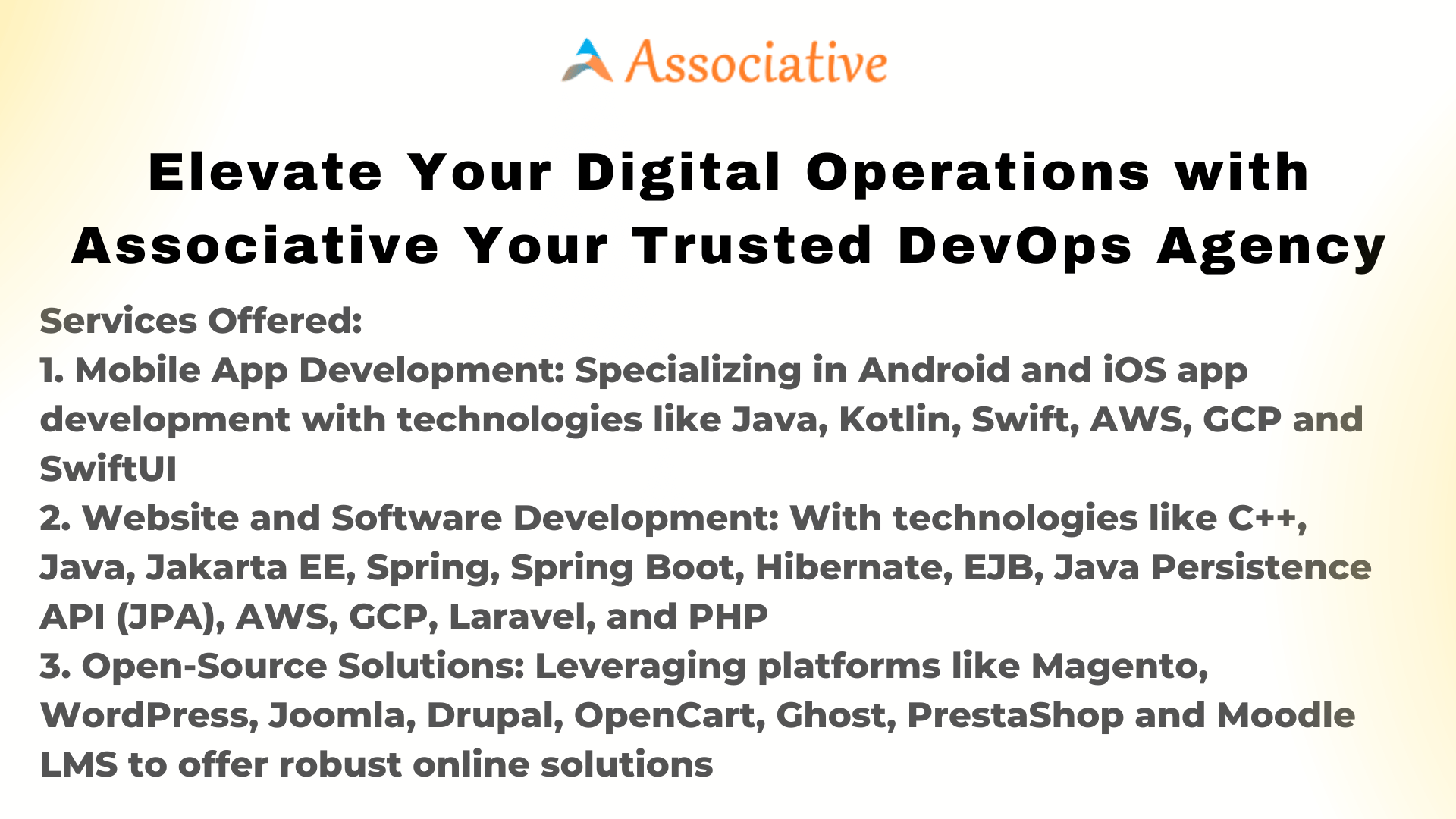 Associative, based in Lohegaon, Pune, is your trusted partner for mobile app development, website and software development, and open-source solutions. With their expertise and unwavering commitment to excellence, Associative can empower your business to thrive in the digital age. Contact them today and embark on a journey to enhance your business with innovative and reliable technology solutions. As your trusted DevOps agency, Associative is poised to optimize your digital processes and ensure your success in the competitive digital landscape.