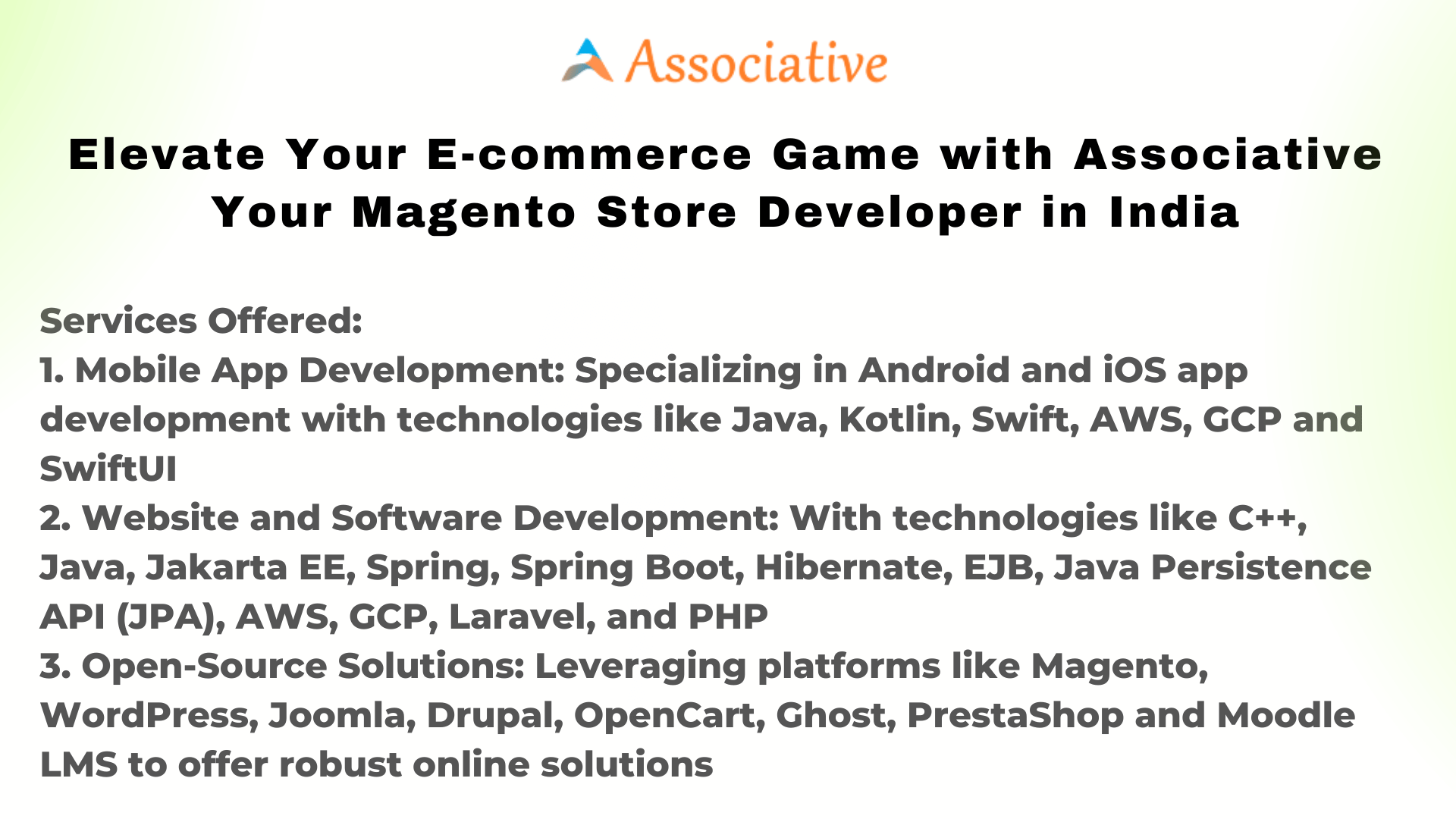 In conclusion, if you\’re searching for a top-tier Magento store developer in India, Associative is the name to trust. With a diverse range of tech-savvy services and a commitment to excellence, they can help you enhance your online store\’s performance and customer experience. Don\’t miss the opportunity to boost your e-commerce success – choose Associative and embark on a journey towards online retail excellence. Contact them today to start your project!