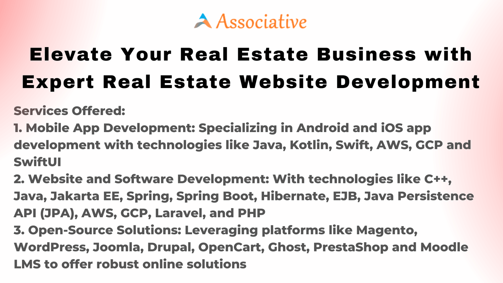 Associative understands the unique needs of the real estate industry and specializes in creating customized websites that cater to those needs. Our comprehensive range of services includes not only real estate website development but also mobile app development, software development, and open-source solutions. Let\’s explore how Associative can help you elevate your real estate business.
