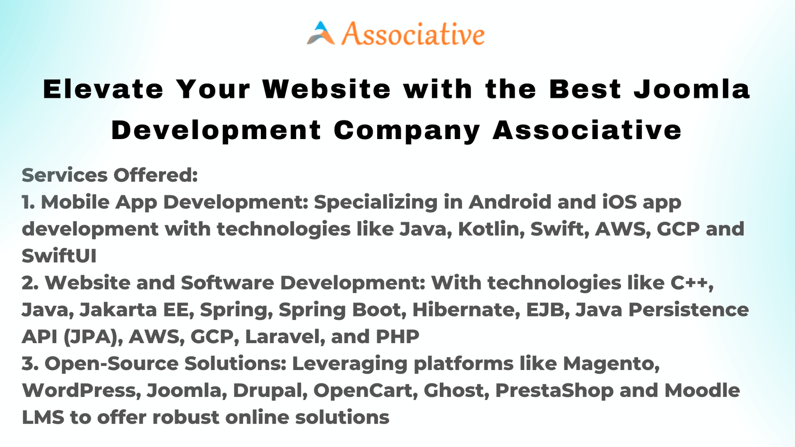 When it comes to creating a compelling online presence, choosing the right Joomla development company is crucial. Associative, based in Lohegaon, Pune, stands out as the best Joomla development company, offering expertise, innovation, custom solutions, and a client-centric approach that sets them apart in the industry. Whether you\’re looking to build a personal blog, an e-commerce site, or a corporate portal, Associative has the skills and experience to bring your vision to life. Elevate your website with the power of Joomla and the expertise of Associative. Your online success begins here!