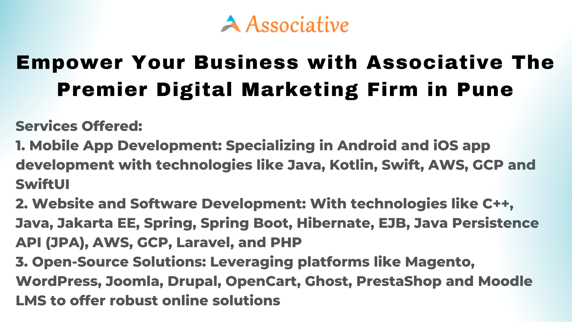 In today\’s fiercely competitive digital landscape, having a trusted partner like Associative can be a gamechanger. With their expertise in mobile app development, website and software development, and opensource solutions, Associative is wellpositioned to elevate your online presence and help you achieve your digital marketing objectives.