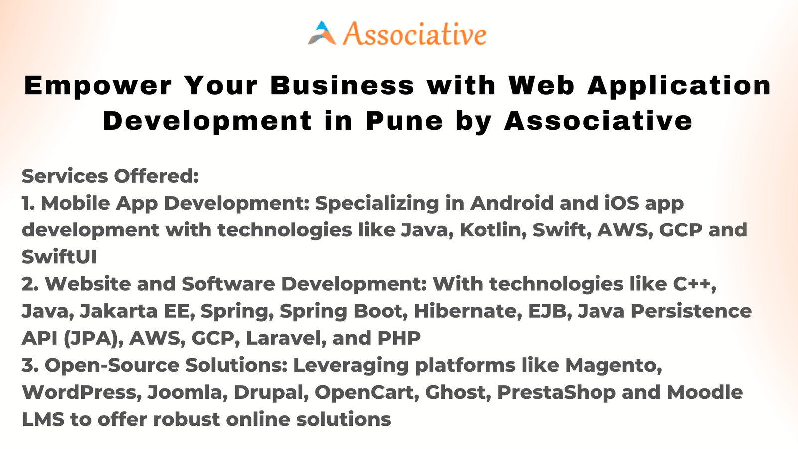 2. Website and Software Development: If you\’re in need of a robust website or custom software solution, Associative is your trusted partner. Their proficient professionals are skilled in a plethora of technologies, including C++, Java, Jakarta EE, Spring, Spring Boot, Hibernate, EJB (Enterprise JavaBeans), Java Persistence API (JPA), AWS, GCP, Laravel, and PHP. This extensive array of expertise equips them to handle projects of any scale and complexity.