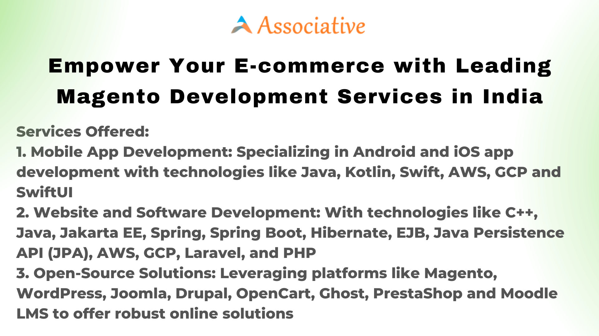 Don\’t miss the opportunity to work with a leading Magento development services provider in India. Contact Associative today and embark on a journey to create a powerful and feature-rich e-commerce platform that will propel your online business to new heights!