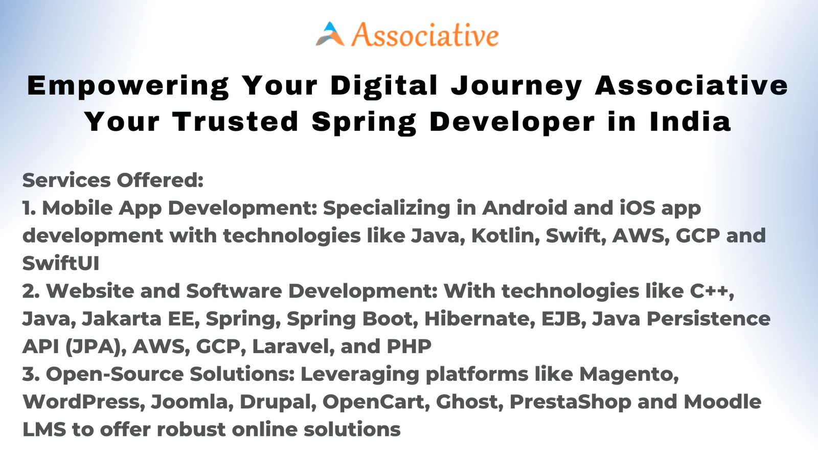 In the digital age, staying ahead of the curve is essential for businesses of all sizes. To achieve this, having a skilled Spring developer in India by your side is crucial. If you\’re on the lookout for a trusted partner to assist you in your digital endeavors, Associative is your answer. Based in Lohegaon, Pune, Associative is a prominent partnership firm offering a wide spectrum of digital services, including Spring development, mobile app development, website and software development, and opensource solutions.