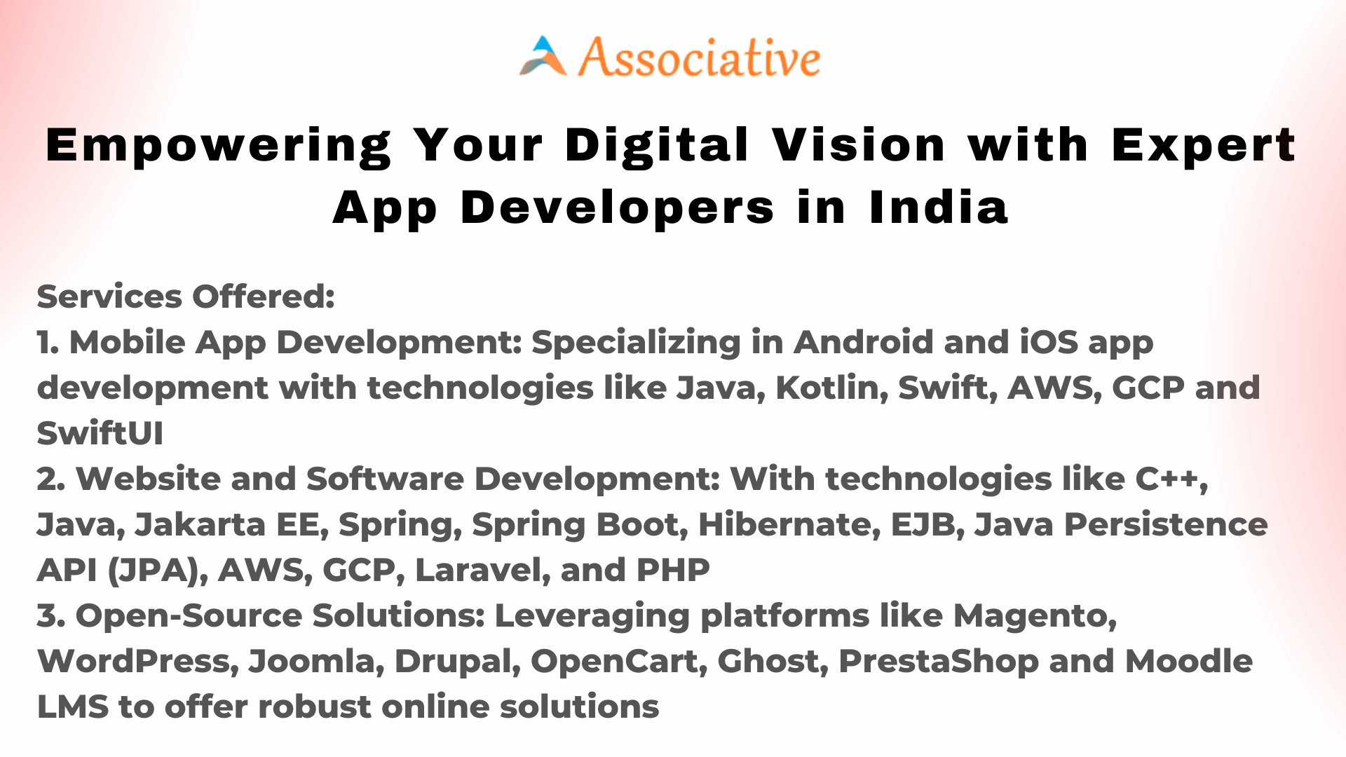 In conclusion, if you’re seeking expert app developers in India, Associative in Pune, Maharashtra, India, is your reliable partner. Their wide range of services, technical expertise, and unwavering commitment to quality make them a leader in the field. Empower your digital vision with Associative’s exceptional app development solutions. Contact them today to discuss your project requirements and embark on a journey of digital success. Your vision awaits, and Associative is here to bring it to life.