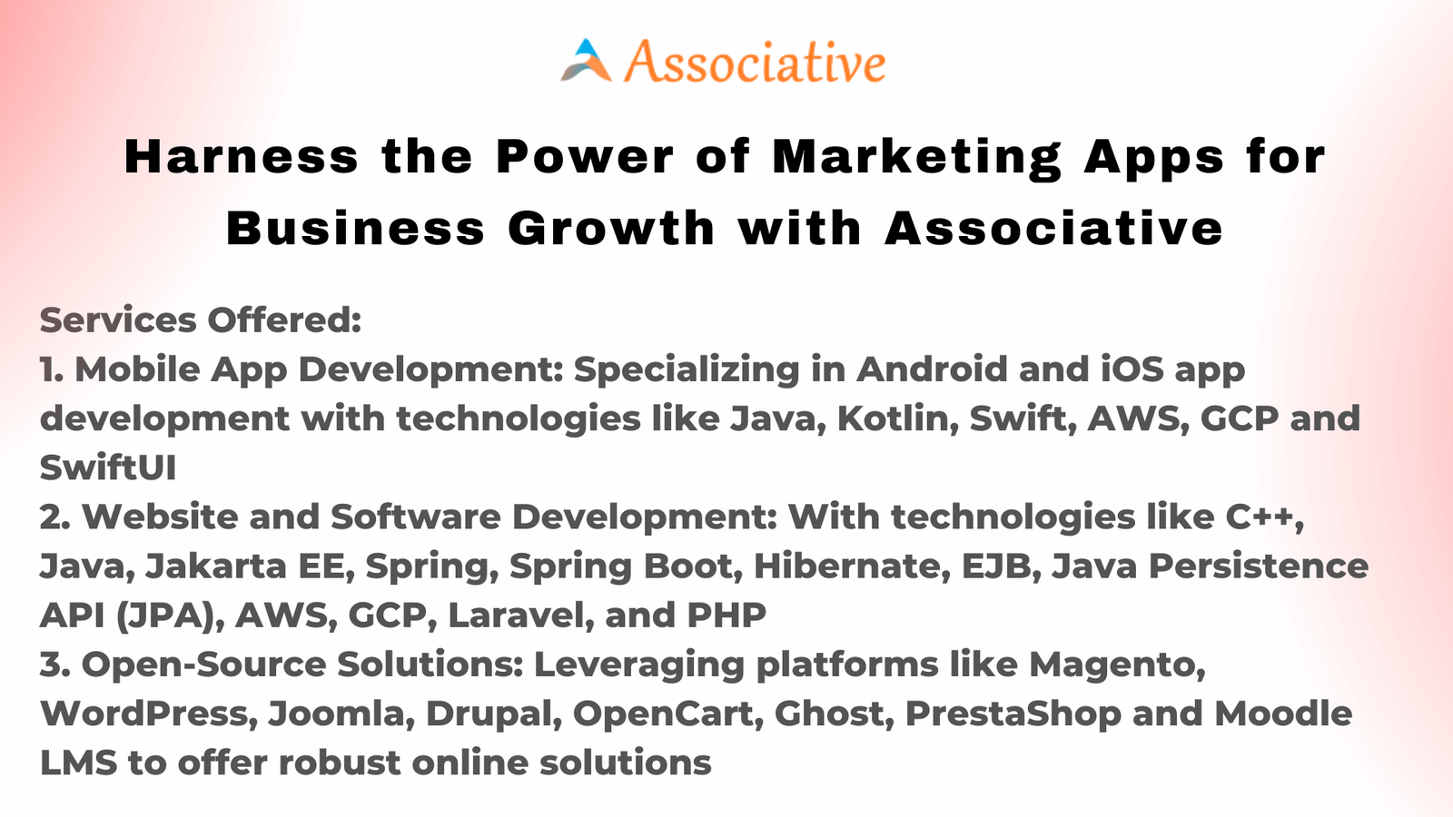 Associative specializes in developing marketing apps for Android and iOS platforms, utilizing cutting-edge technologies such as Java, Kotlin, Swift, AWS, GCP, and SwiftUI. Our goal is to create powerful marketing tools that drive growth, enhance brand visibility, and foster customer loyalty.