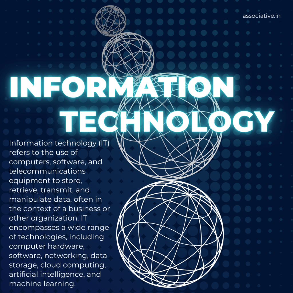 Information technology (IT) refers to the use of computers, software, and telecommunications equipment to store, retrieve, transmit, and manipulate data, often in the context of a business or other organization. IT encompasses a wide range of technologies, including computer hardware, software, networking, data storage, cloud computing, artificial intelligence, and machine learning.