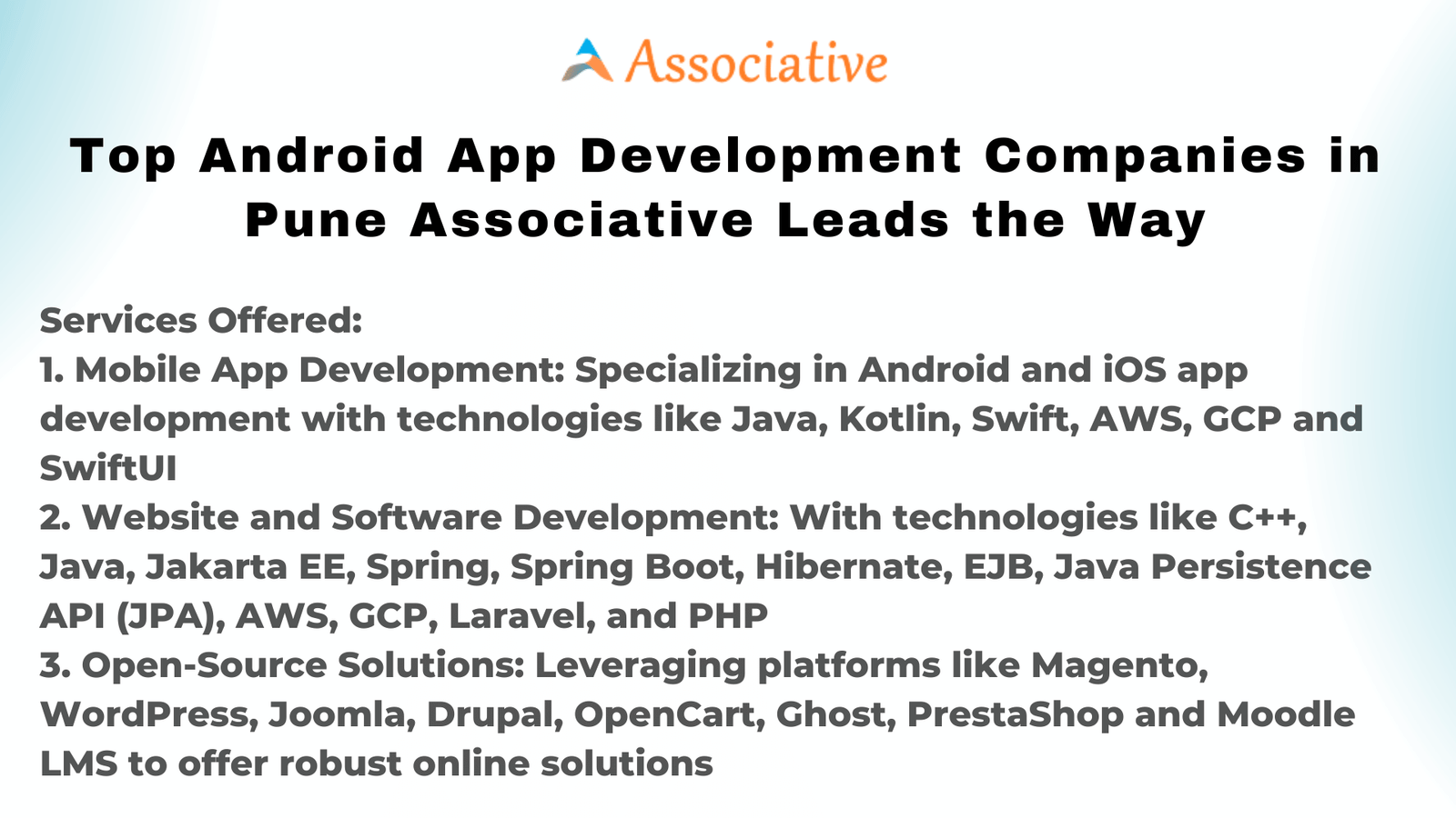 In conclusion, if you’re looking for one of the top Android app development companies in Pune, Associative in Pune, Maharashtra, India, is your trusted partner. Their diverse range of services, technical expertise, and commitment to quality make them a leader in the field. Elevate your business with Associative’s top-notch Android app development solutions. Contact them today to discuss your project requirements and embark on a journey of digital success. Your path to a successful Android app begins with Associative.