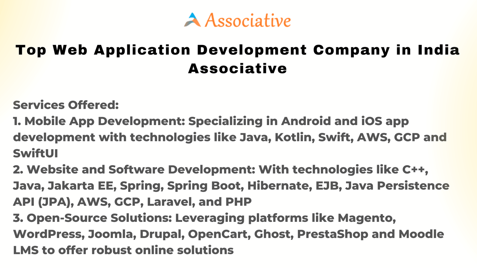 2. Website and Software Development: If you\’re looking to build a powerful website or custom software solution, Associative has you covered. They are proficient in a variety of technologies including C++, Java, Jakarta EE, Spring, Spring Boot, Hibernate, EJB (Enterprise JavaBeans), Java Persistence API (JPA), AWS, GCP, Laravel, and PHP. This wide array of expertise ensures that they can handle projects of any scale and complexity.