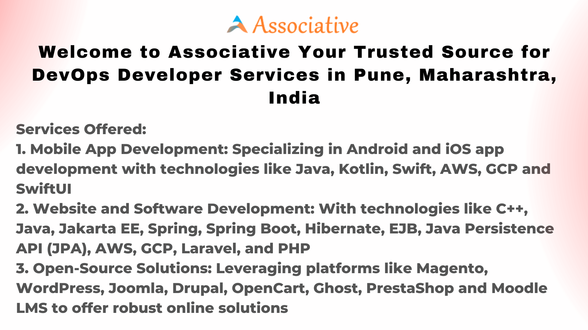 Associative is a well-known partnership firm located in the vibrant city of Pune. We understand the critical role that DevOps developers play in modern software development, and we are here to provide top-notch DevOps solutions tailored to your needs.