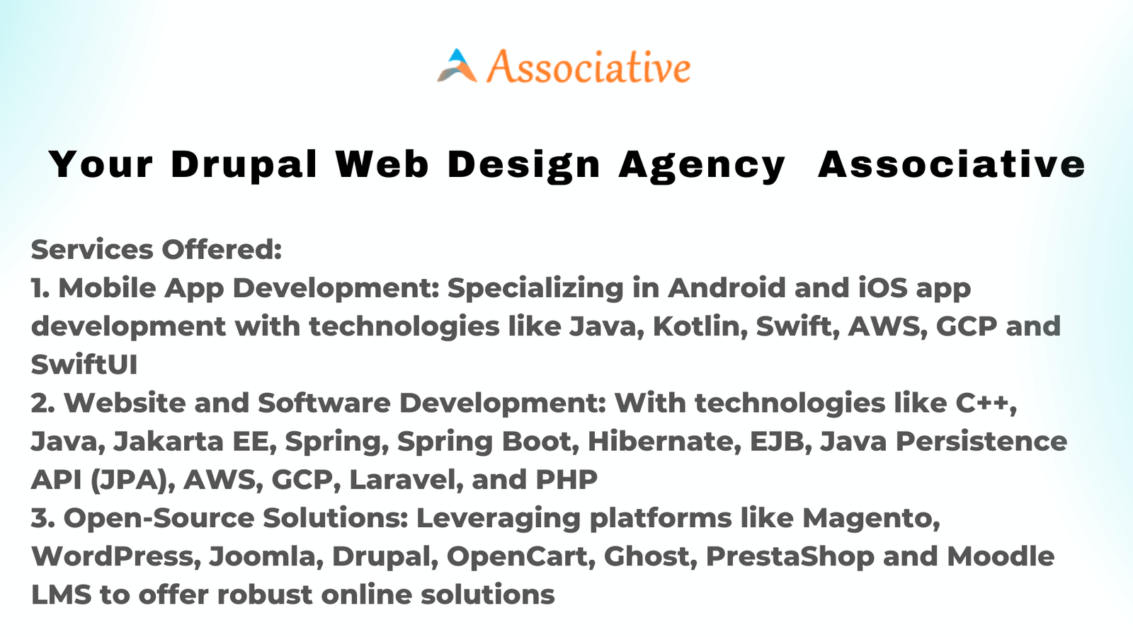 Associative\’s commitment to excellence and client satisfaction sets us apart as a trusted name in the Drupal web design agency industry. We ensure that your Drupal website not only looks impressive but also functions seamlessly and is userfriendly.