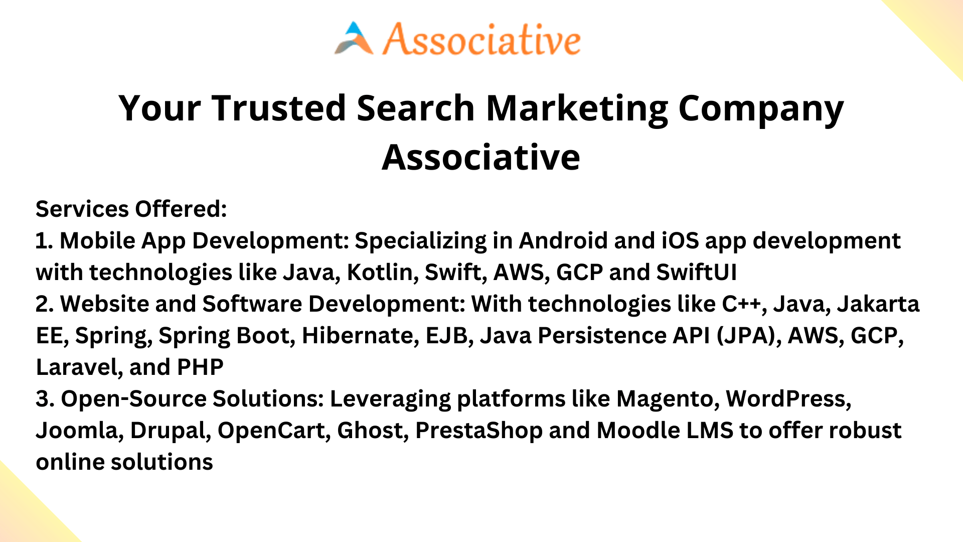 Associative is a prominent partnership firm based in Pune, Maharashtra, India, with a strong commitment to helping businesses succeed in the digital world. As a leading search marketing company, we offer a wide array of services tailored to boost your online presence and drive results.